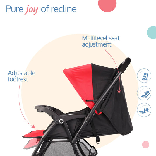 Golf Baby Stroller/Pram with 5 Point Safety Harness, 0-3 Years, Multi Level Recline & Adjustable footrest, Extendable Canopy, Red & Black