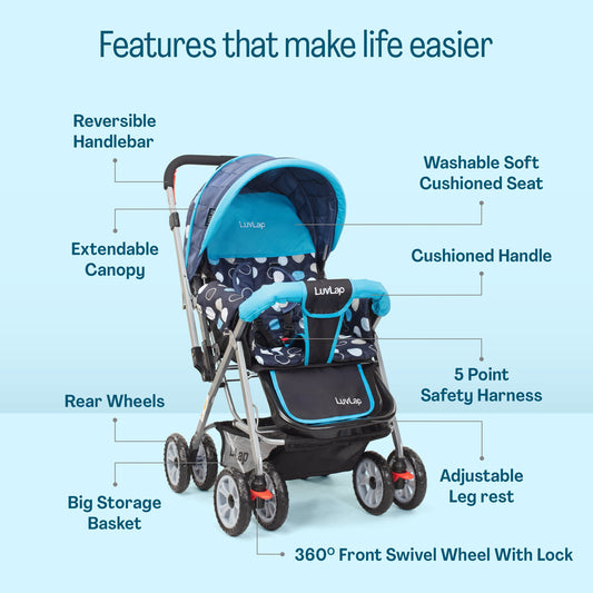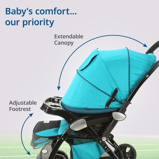- Extra spacious stroller with heavy duty wheels - Best choice for outdoor use. There is reversible handle bar so that you can always keep an eye on your baby