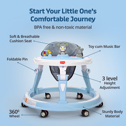 360° Joy Baby Walker for 9+ Months | 3 Level Height Adjustment Walker with Switchable Food & Musical Toy Tray/Advanced Baby Activity Walker, Blue