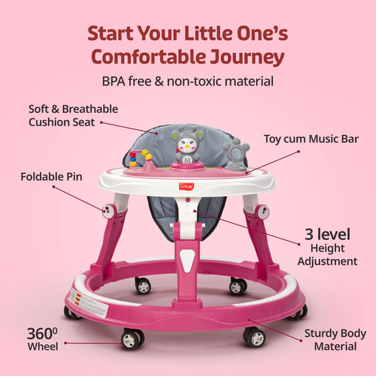 LuvLap 360° Joy Baby Walker 9+ Months | 3 Level Height Adjustment Walker with Switchable Food & Musical Toy Tray/Advanced Baby Activity Walker, Pink