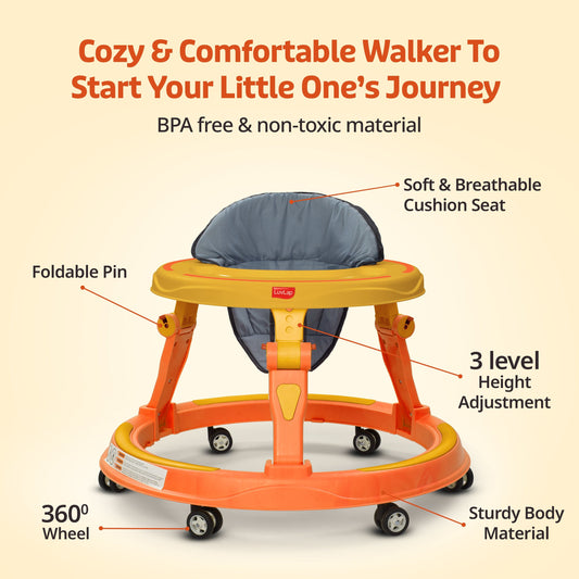 360° Joy Baby Walker 9+ Months | 3 Level Height Adjustment Walker with Switchable Food & Musical Toy Tray/Advanced Baby Activity Walker, Orange
