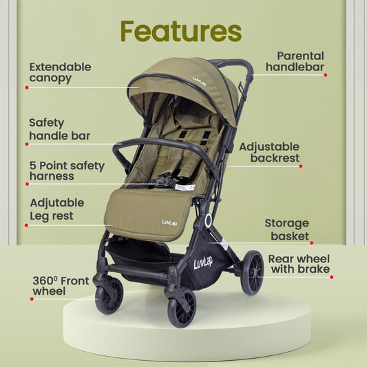 Galaxy Baby Stroller, Pram for Baby with 5 Point Safety Harness, Spacious Cushioned seat with Multi Level seat Recline, Easy Fold, Lightweight Stroller for 0 to 3 Years (Green & Black)