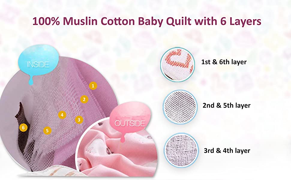 - 100% MUSLIN-COTTON MATERIAL : Made from 100% high thread count Muslin-Cotton Material. 6 Layer Thick Quilt is Extremely Soft & Smooth, Gentle on Skin, Comfortable & Cozy