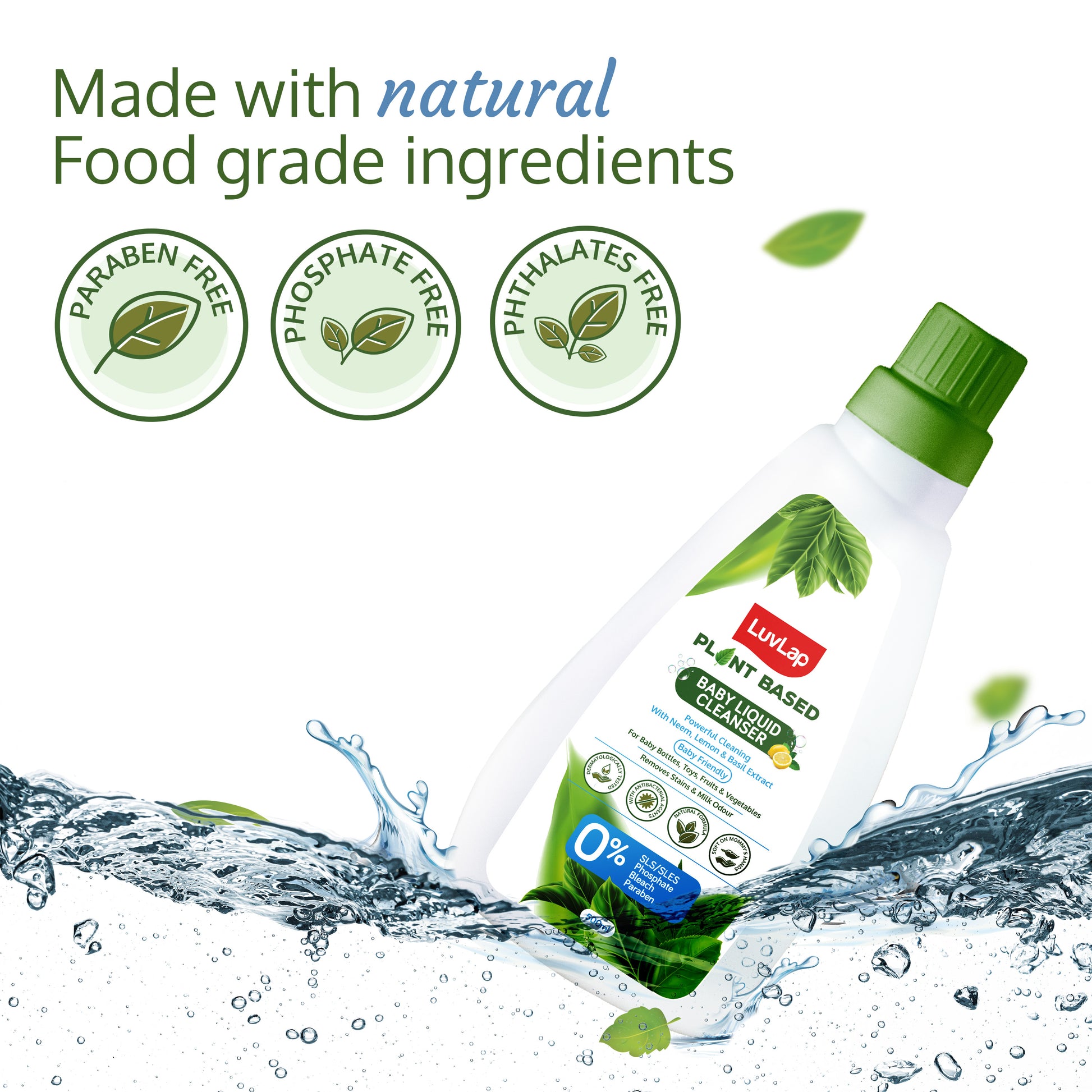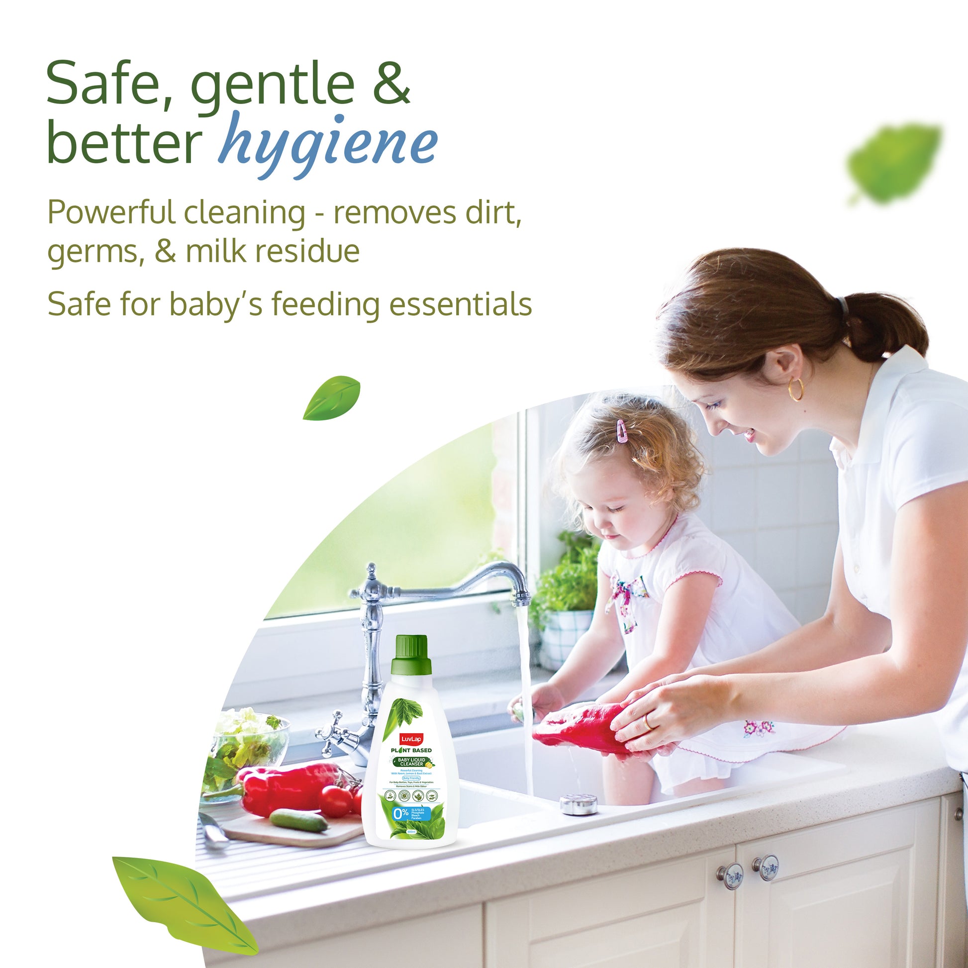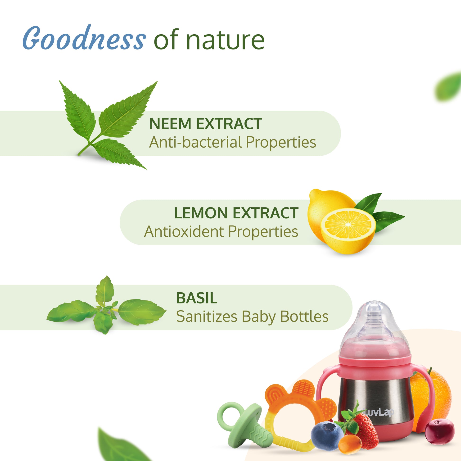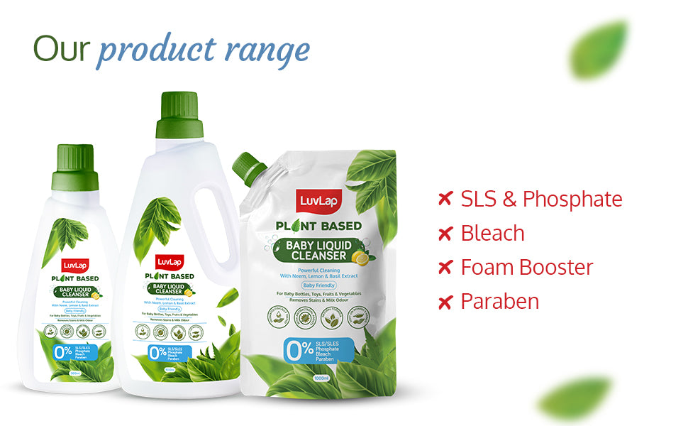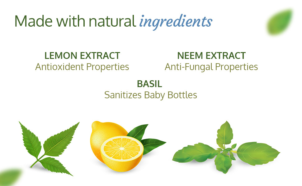 - Plant-Based Cleanser: Your go-to solution, enriched with the goodness of Neem, Lemon, and Basil, for spotless cleanliness for your baby's feeding essentials