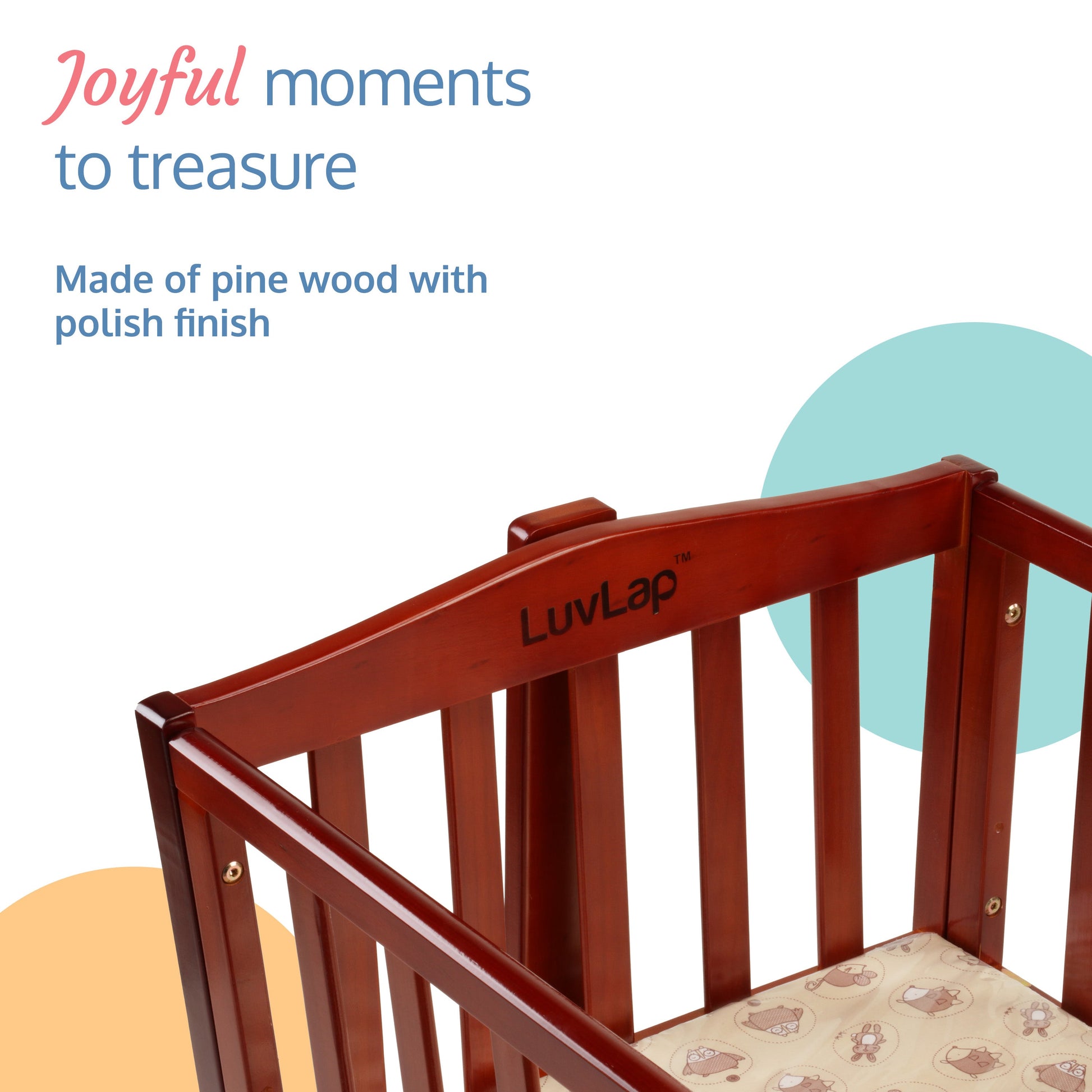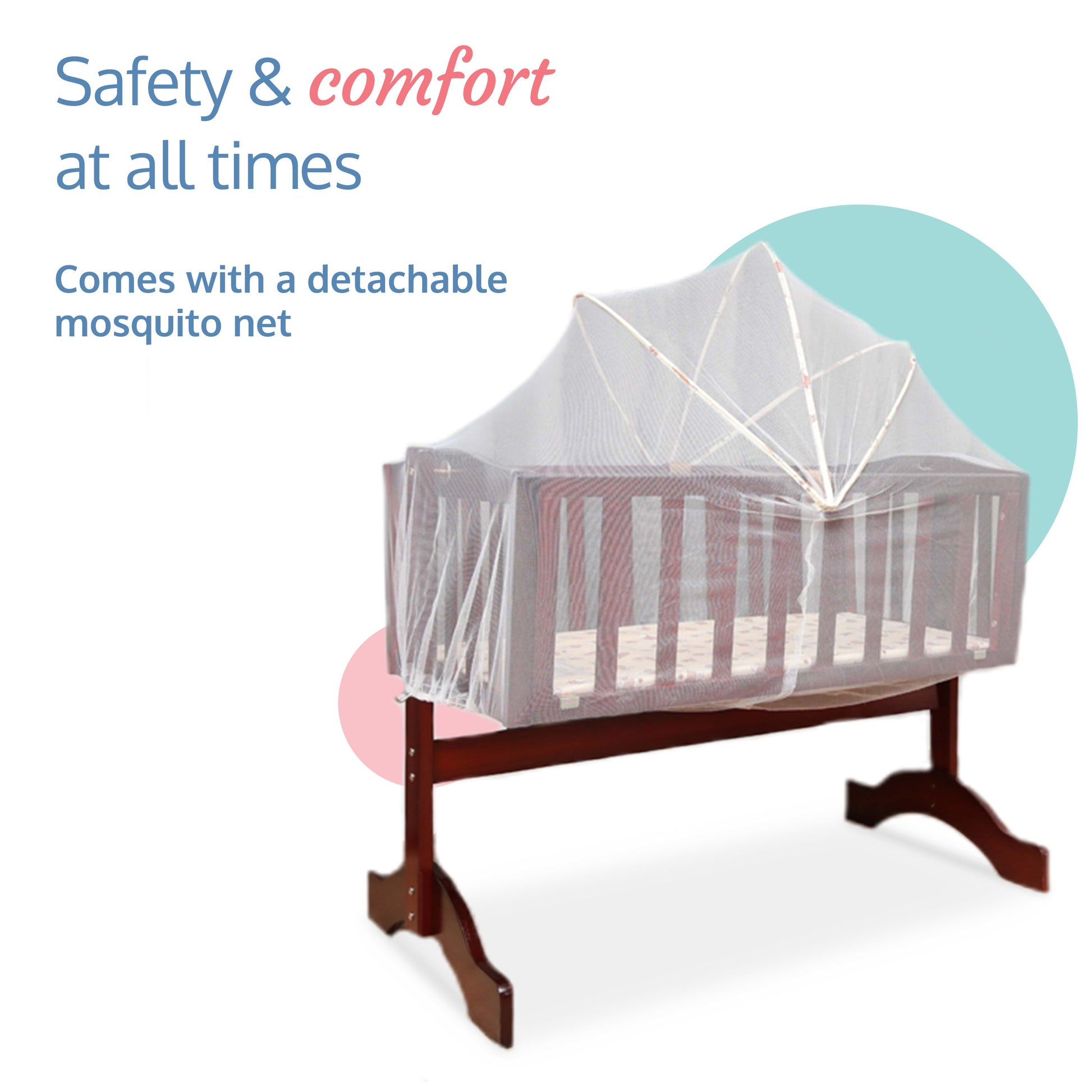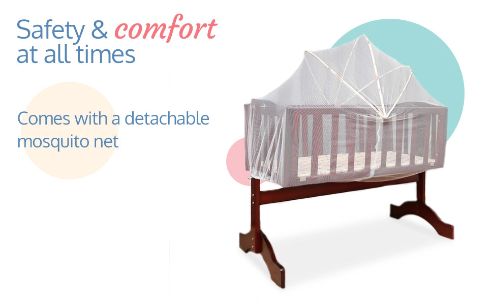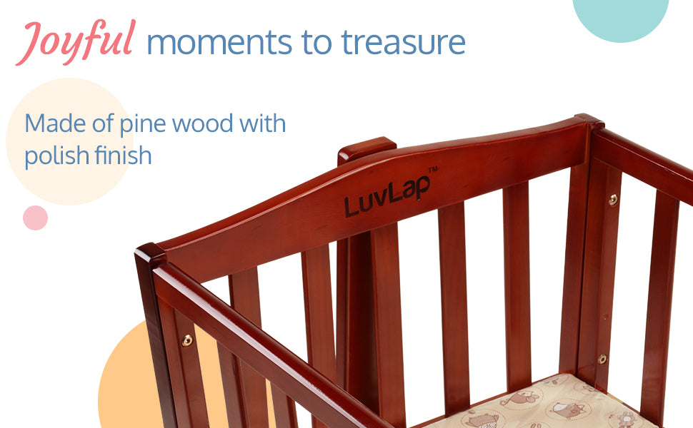 LuvLap Baby wooden cot with cradle is designed for little babies to protect them from fall down. Baby Cot with Cradle helps you to make your baby naptime as restful as possible. It is Certified as per European Standards, and that the Cot can be easily converted into cradle. It comes with Mosqito net, Recommended age - 0 - 12 Months & weght up to 15 Kgs
