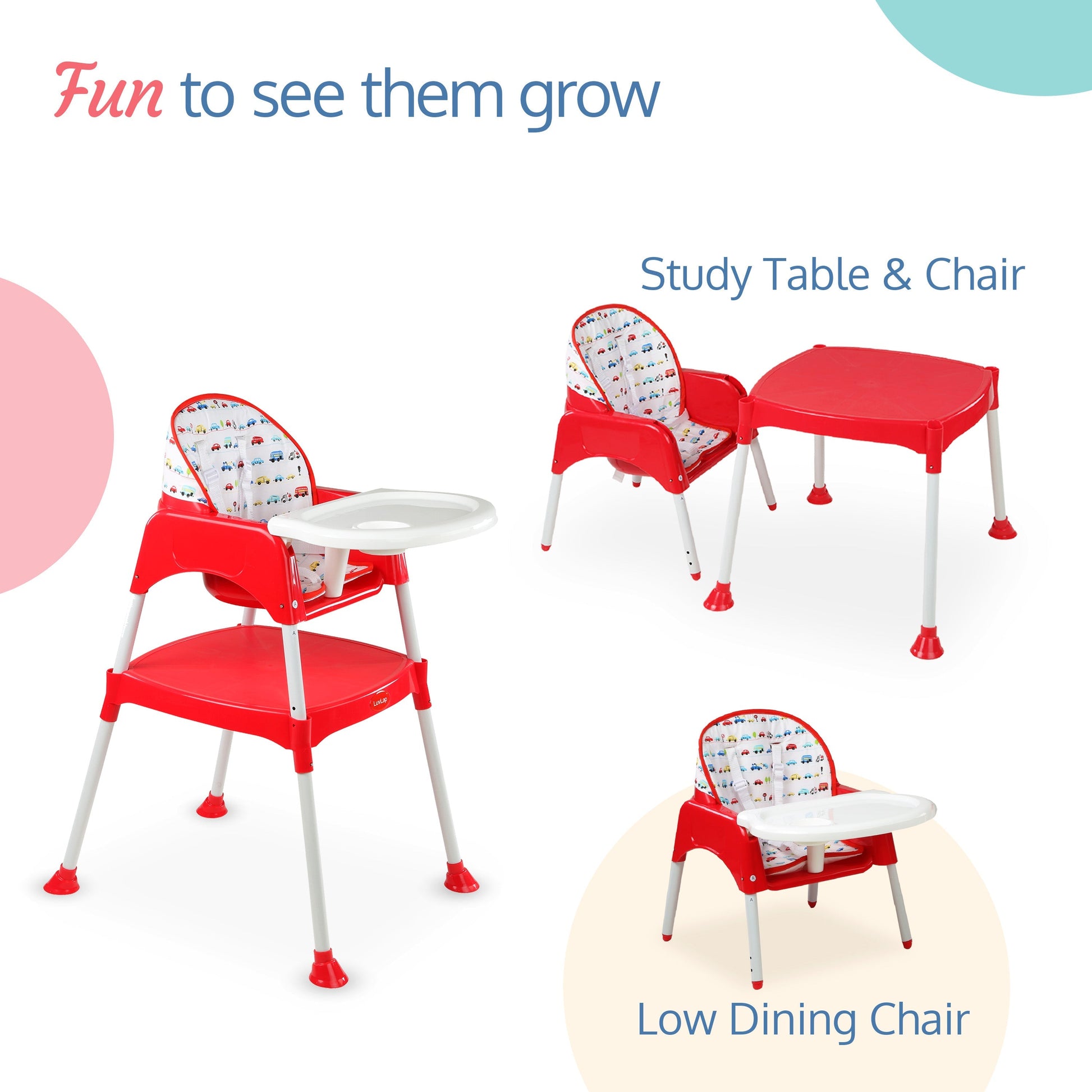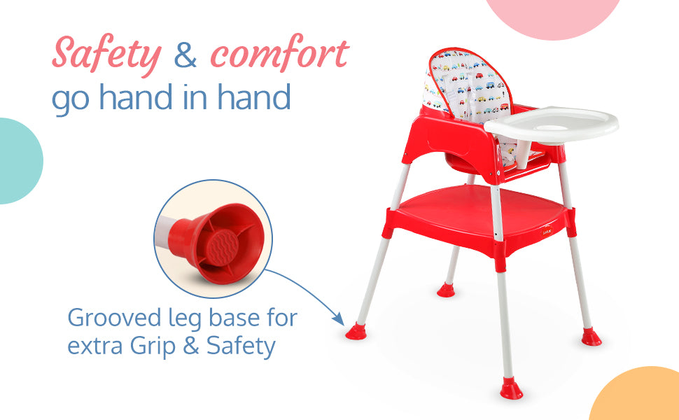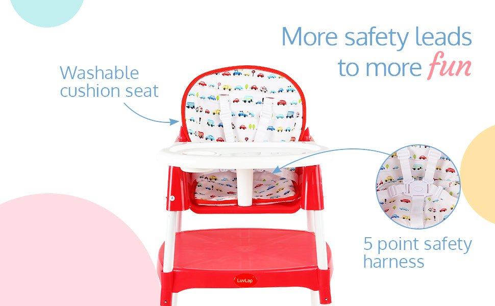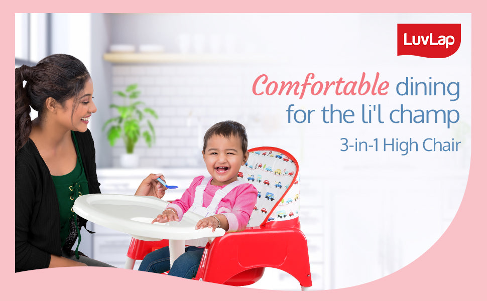 Luvlap's 3-in-1 convertible baby high chair grows with your baby. It can be used as a high chair, low chair and a study table and chair for toddler. With 5 point safety harness, height adjustment, washable seat cushion, and removable dining tray with transparent tray cover for easy cleaning, it is loved by moms.