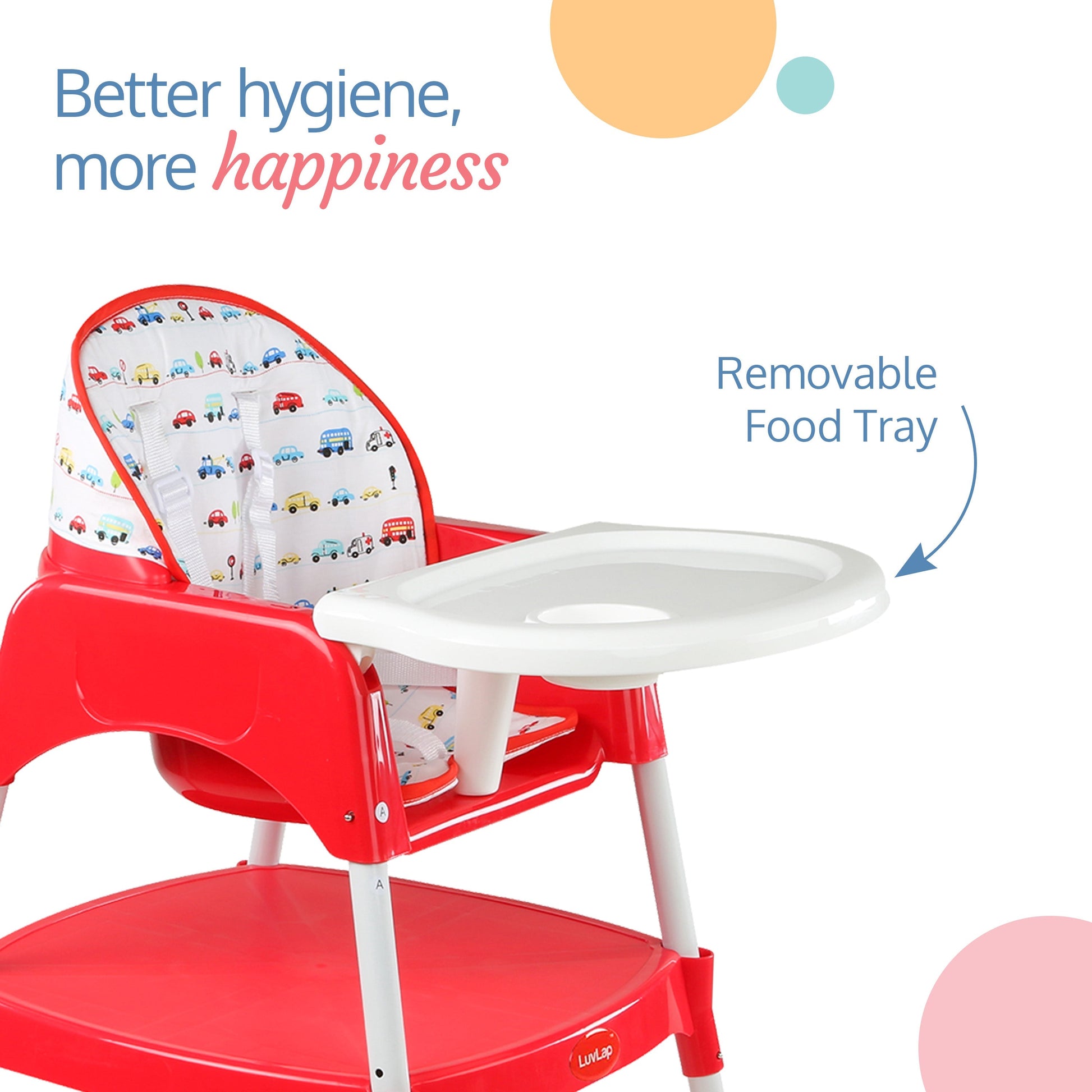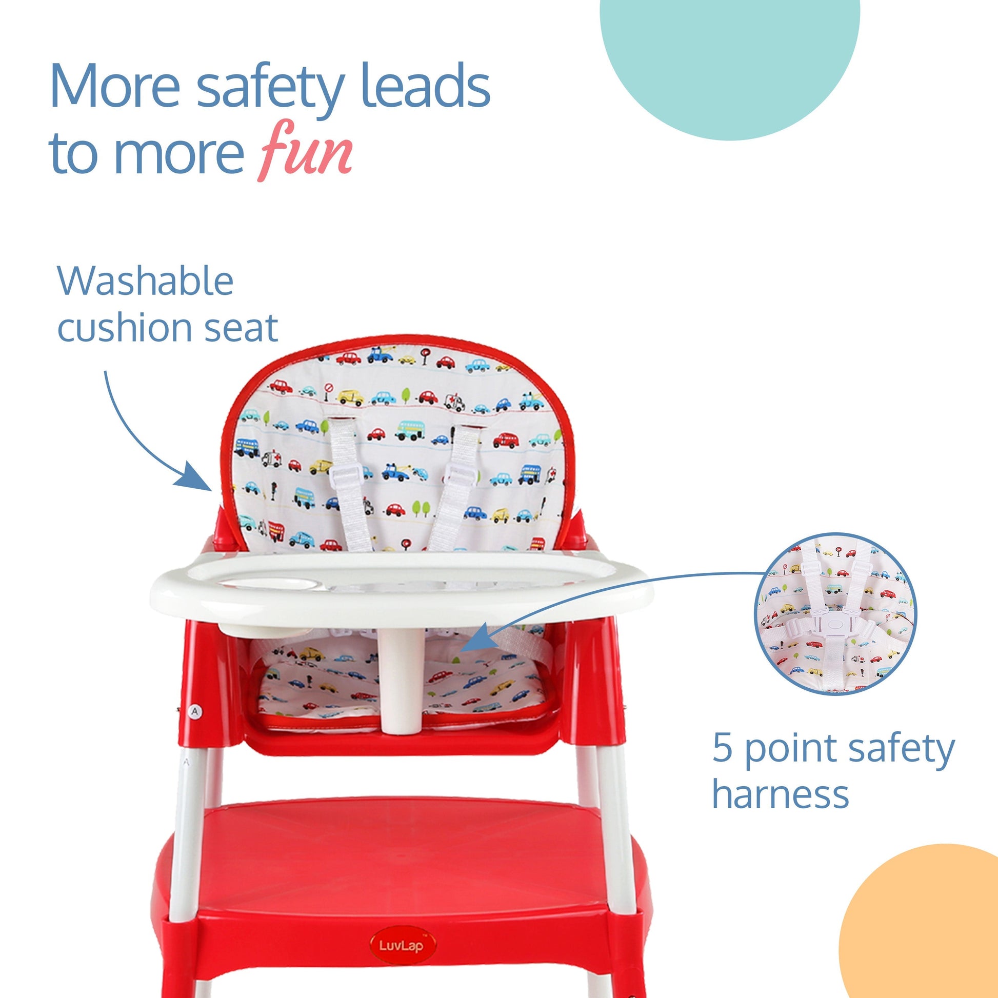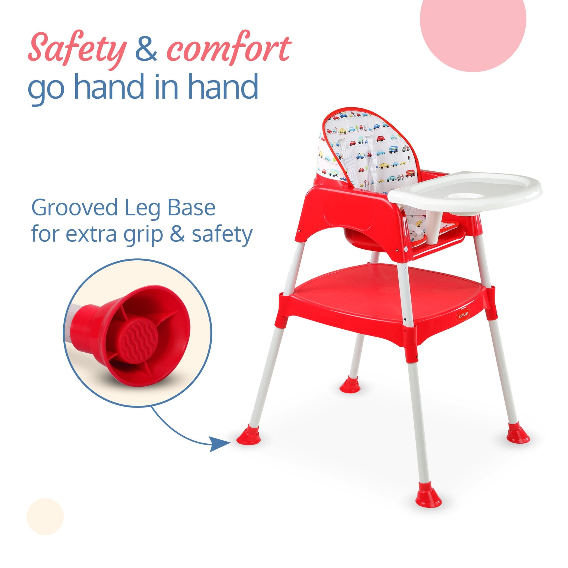 Luvlap's 3-in-1 convertible baby high chair grows with your baby. It can be used as a high chair, low chair and a study table and chair for toddler. With 5 point safety harness, height adjustment, washable seat cushion, and removable dining tray with transparent tray cover for easy cleaning, it is loved by moms.