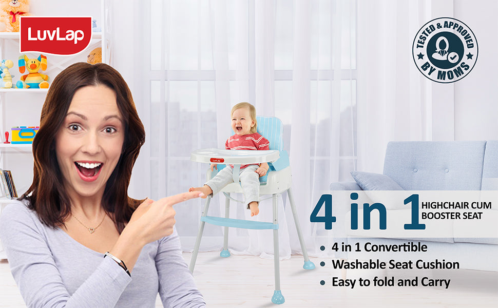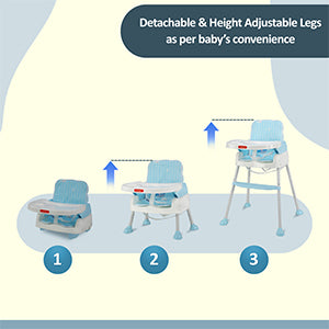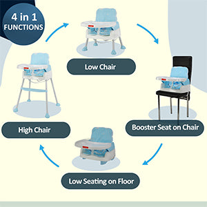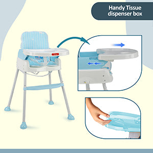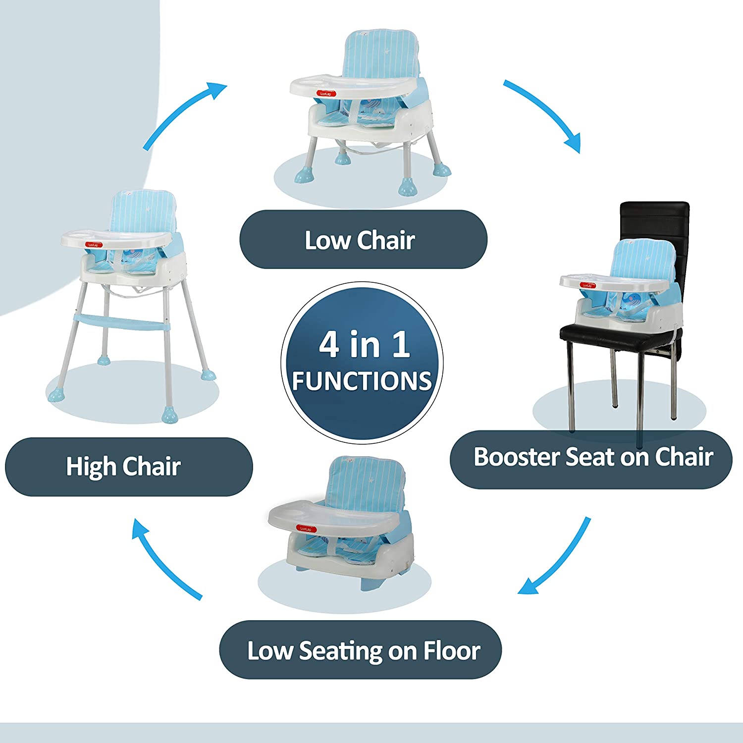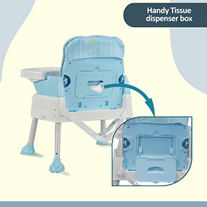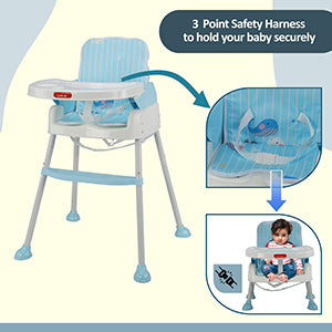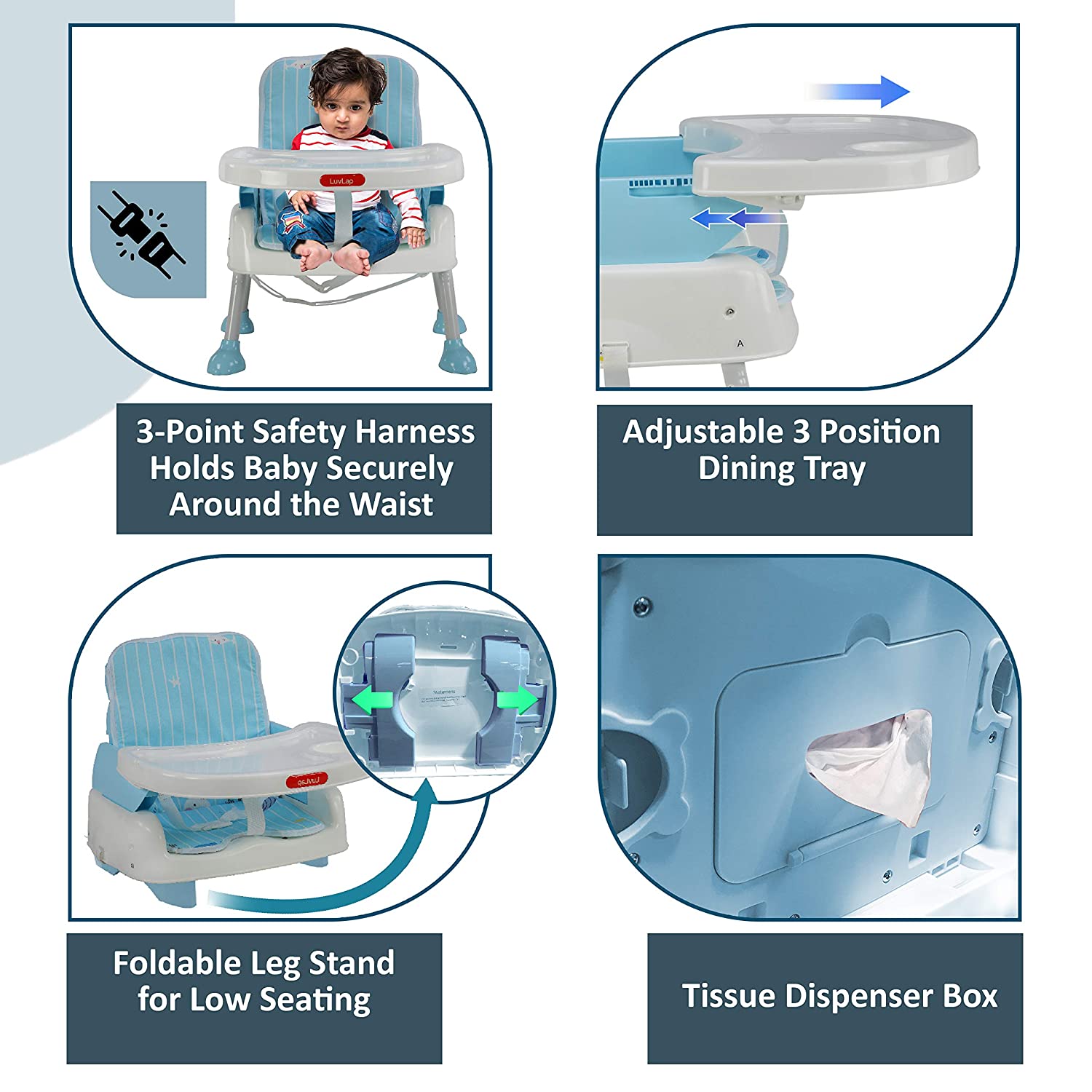 This 4-in-1 convertible high chair can be used as a high chair, low chair, Booster seat on a dining chair and as well as on floor. It comes with adjustable removable food tray and seat cover that can easily be washed. With a 3-point safety harness system, adjustable dining tray and a tissue dispenser box makes this a smart solution for Mom. It is foldable and easy to carry.