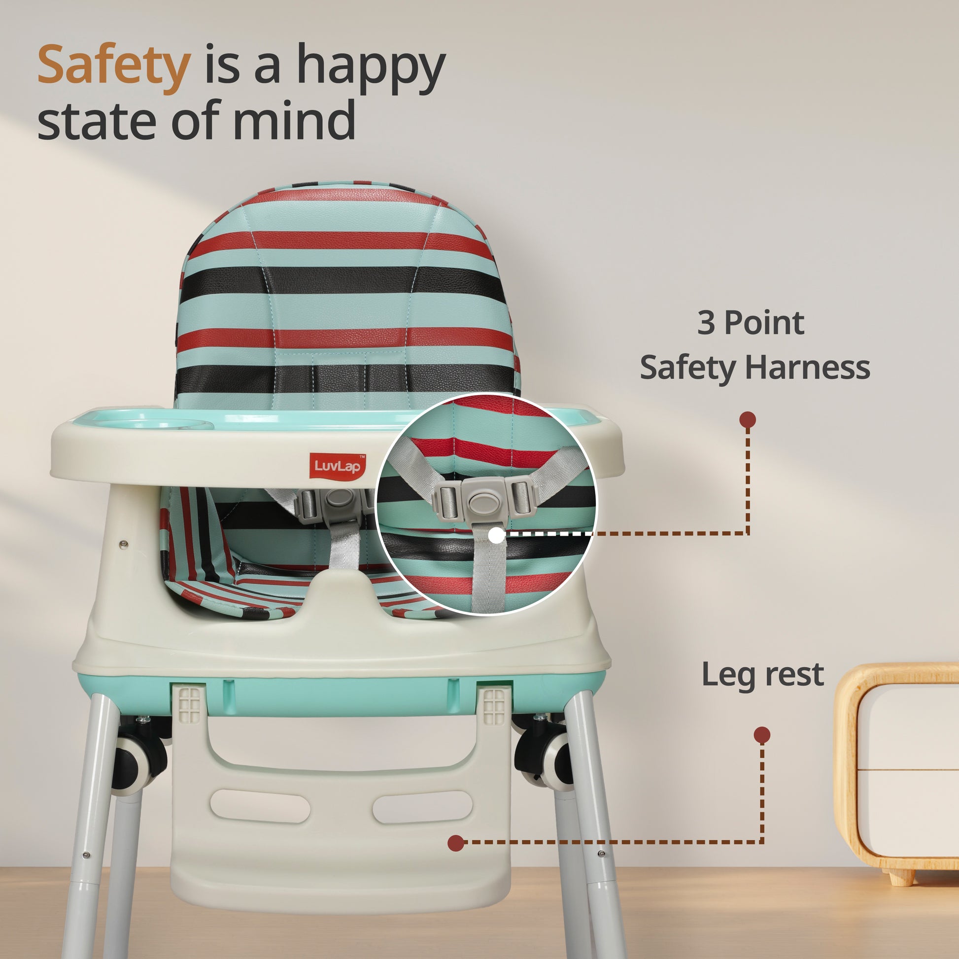 - STURDY, STABLE & SAFE : Height adjustable metal legs with rubber grip & 3 point safety harness makes it sturdy & safe