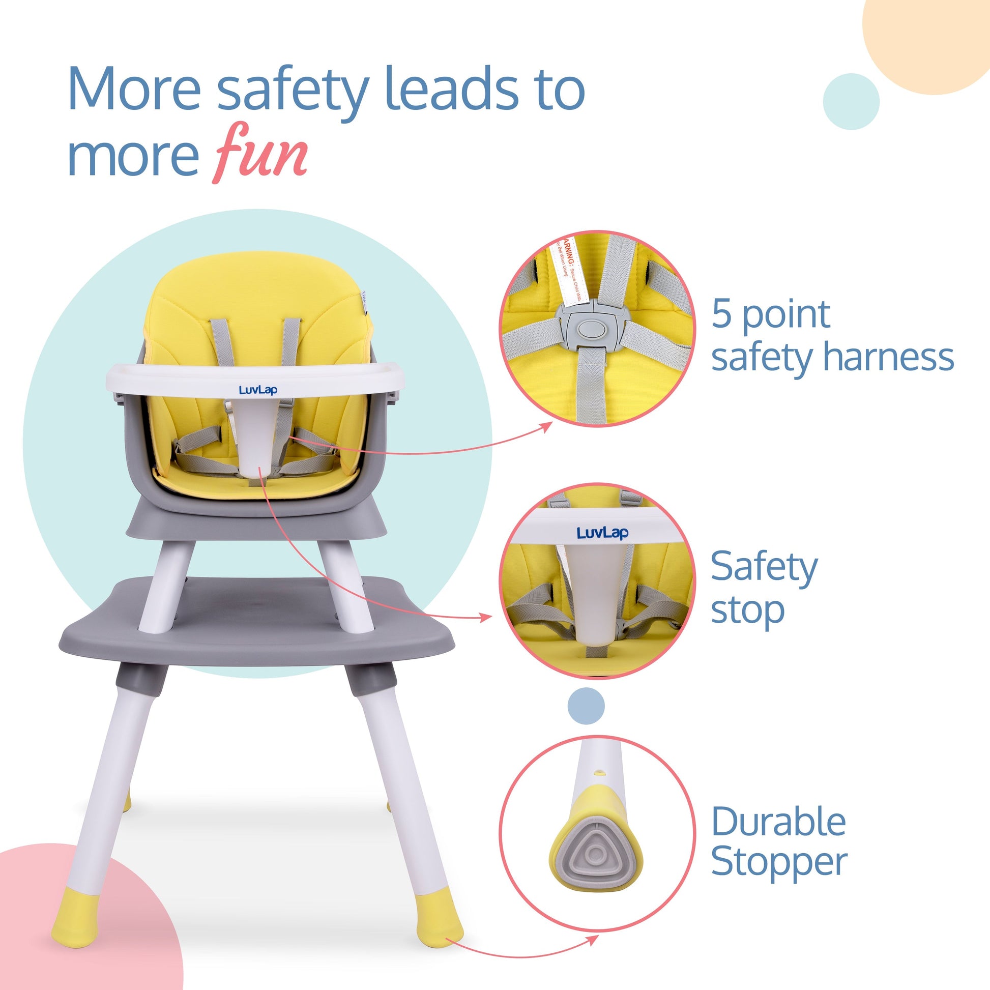 - Ensures maximum safety for the baby with 5 point safety harness and Safety stop