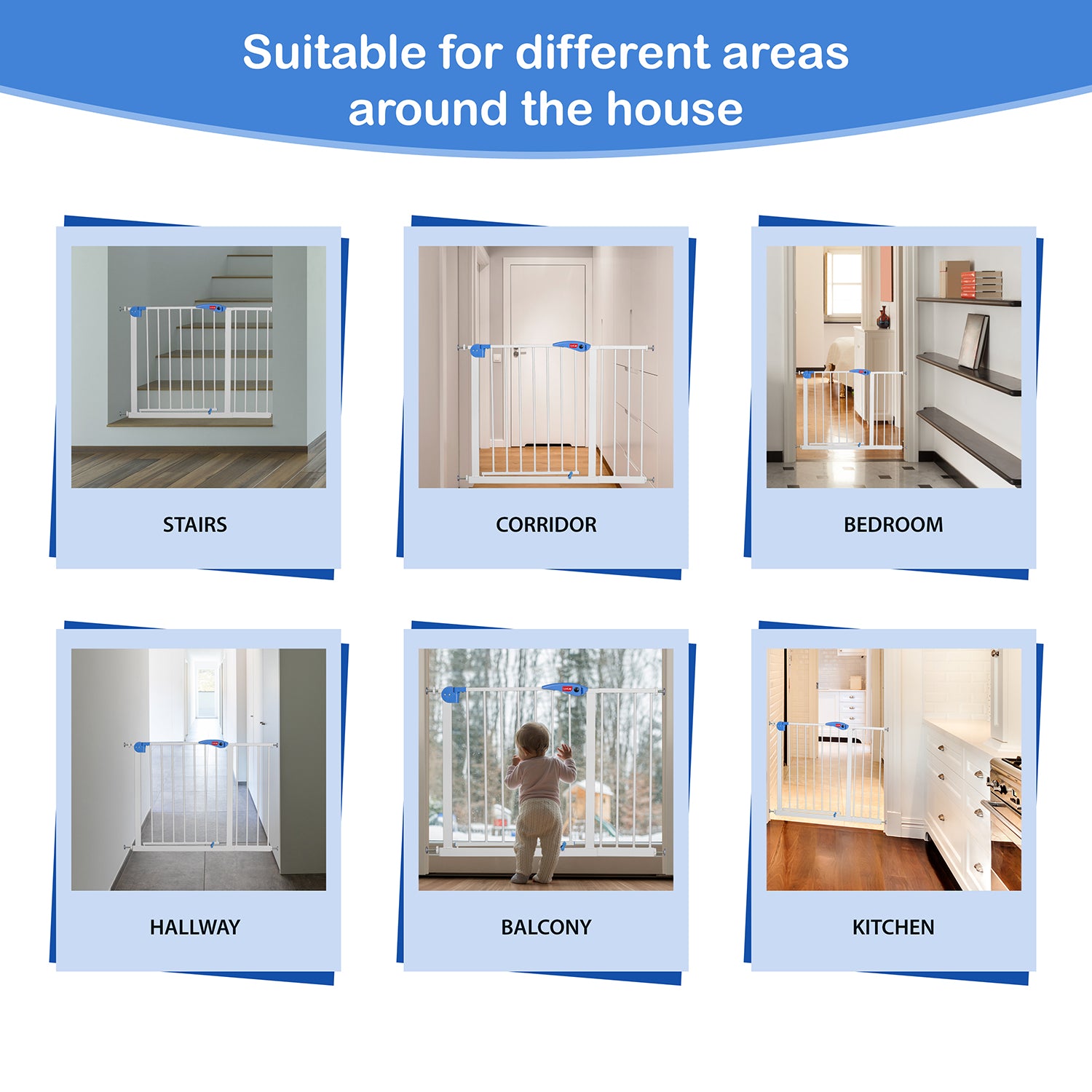 - Suitable for using on doorway width between 105 to 115 cm. Can also be used as staircase gate for baby safety. This model can be used for smaller doors also (by not attaching the extension)