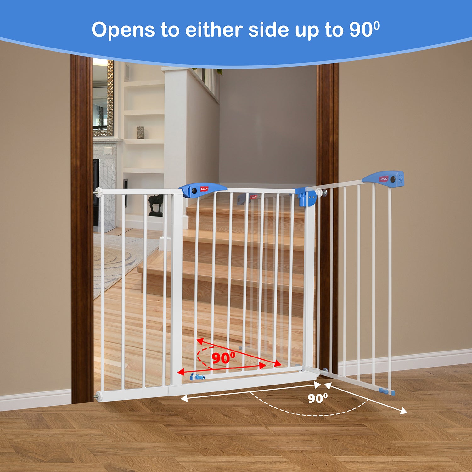 - 180?ø Swing: Gate swings comfortably in both directions. Adults can open it with one hand only in both direction, leaving one hand free to carry the baby