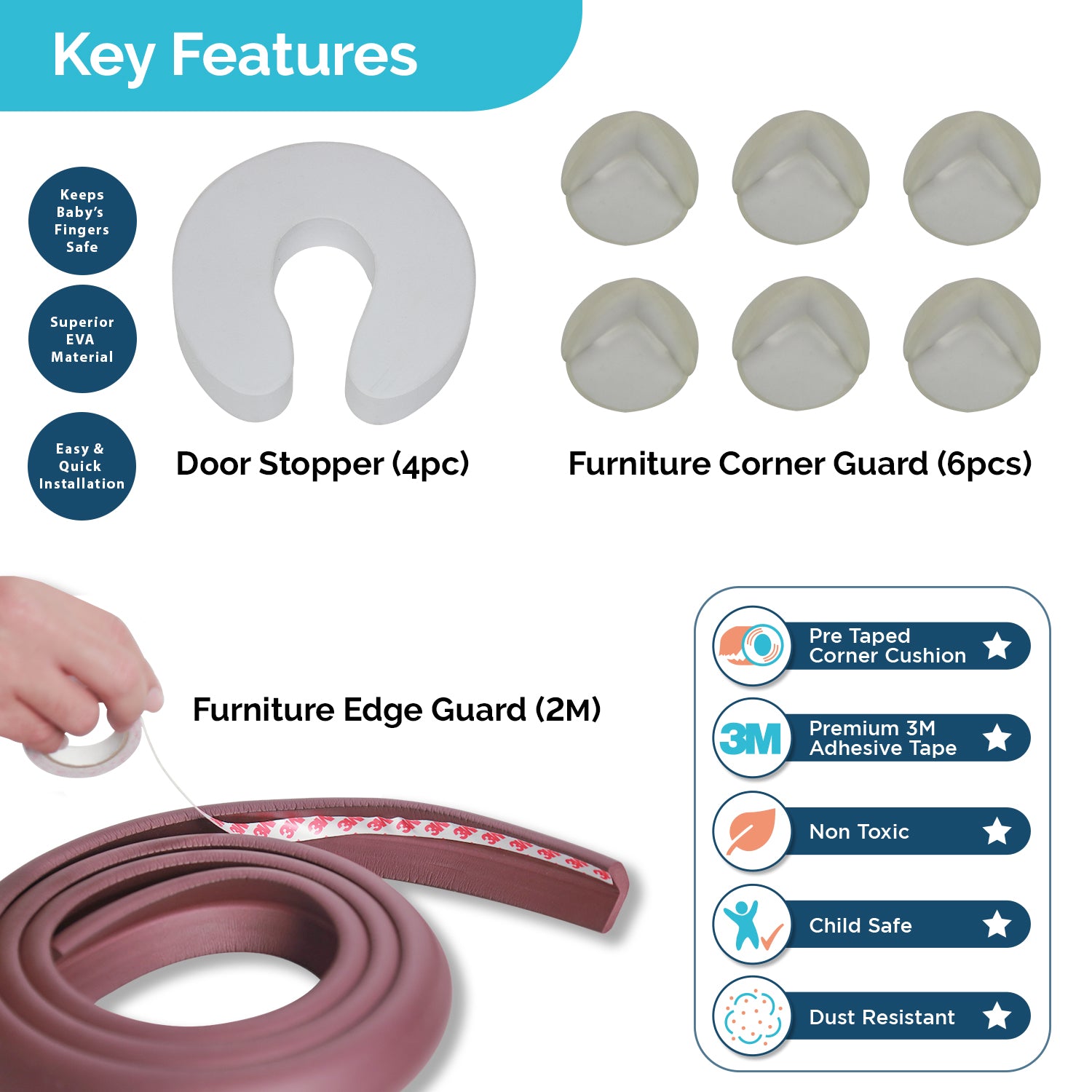 Baby Safety Combo Pack - 2 Metre Edge Protector 4 Door Stoppers 6 Corner Guards 4 Cabinet Locks 4 Safety Locks 10 Socket Covers