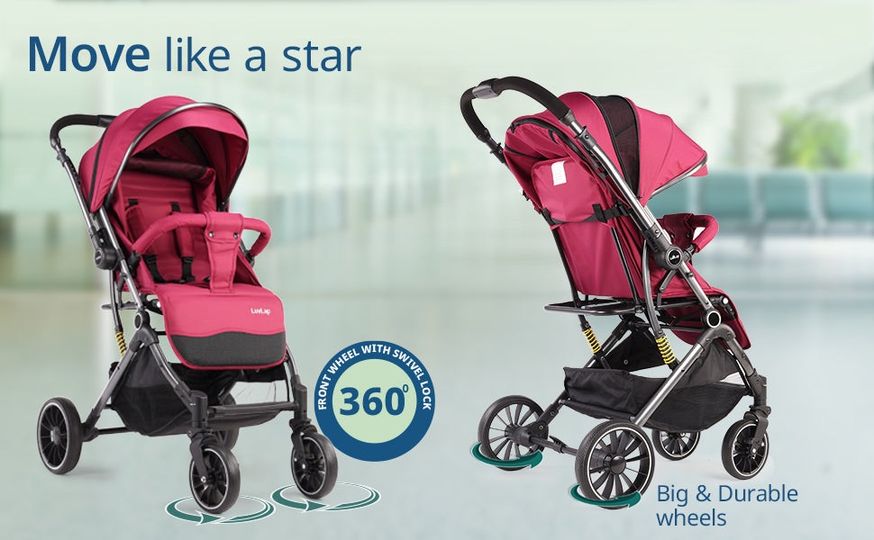 • Extra spacious stroller with heavy duty wheels - Best choice for outdoor use. There is reversible handle bar so that you can always keep an eye on your baby
