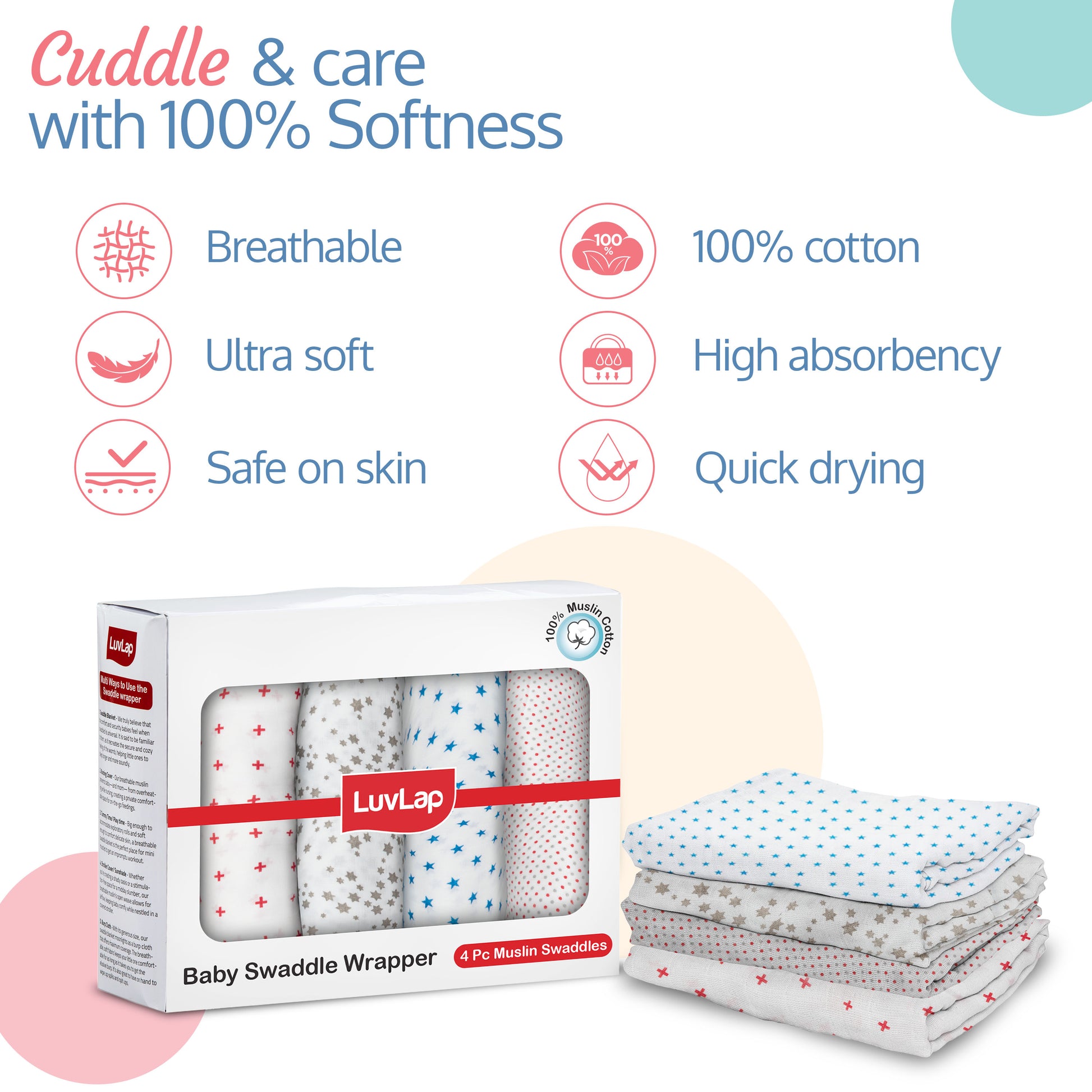 - Baby swaddle pack of 3: Swaddle size 120cm x 100cm. 100% cotton muslin, super soft, comfortable & breathable fabric. Gets softer with every wash. Better airflow ensures that baby isn't overheated