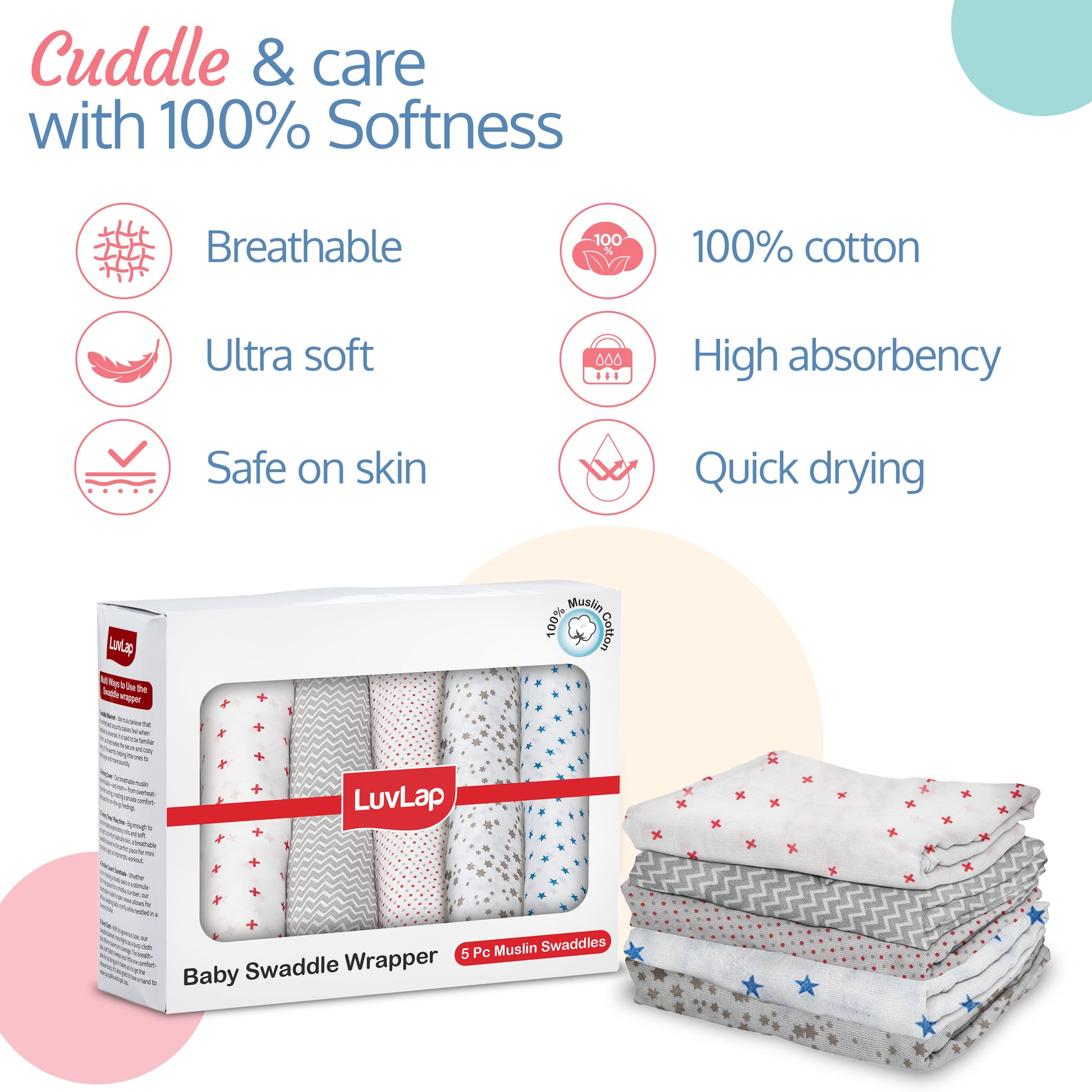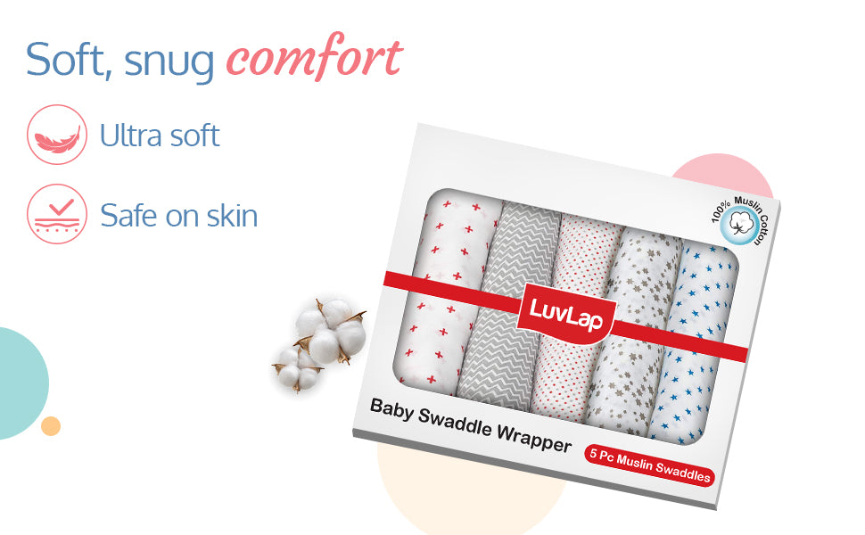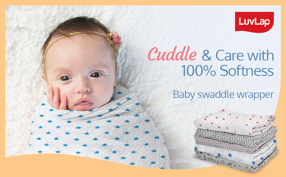 LuvLap 100% Muslin Baby swaddles have Multiple Usage: These soft fabric swaddles can also be used as Baby Wash cloth, Changing Sheet, Burp cloth, Stroller cover, play mat as well as nursing cover for on-the-go feedings etc. The fine quality muslin cloth is soft and comfortable on baby's skin and does not cause any discomfort or irritation.
