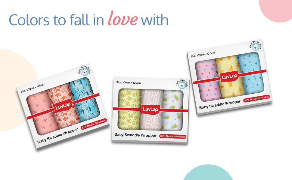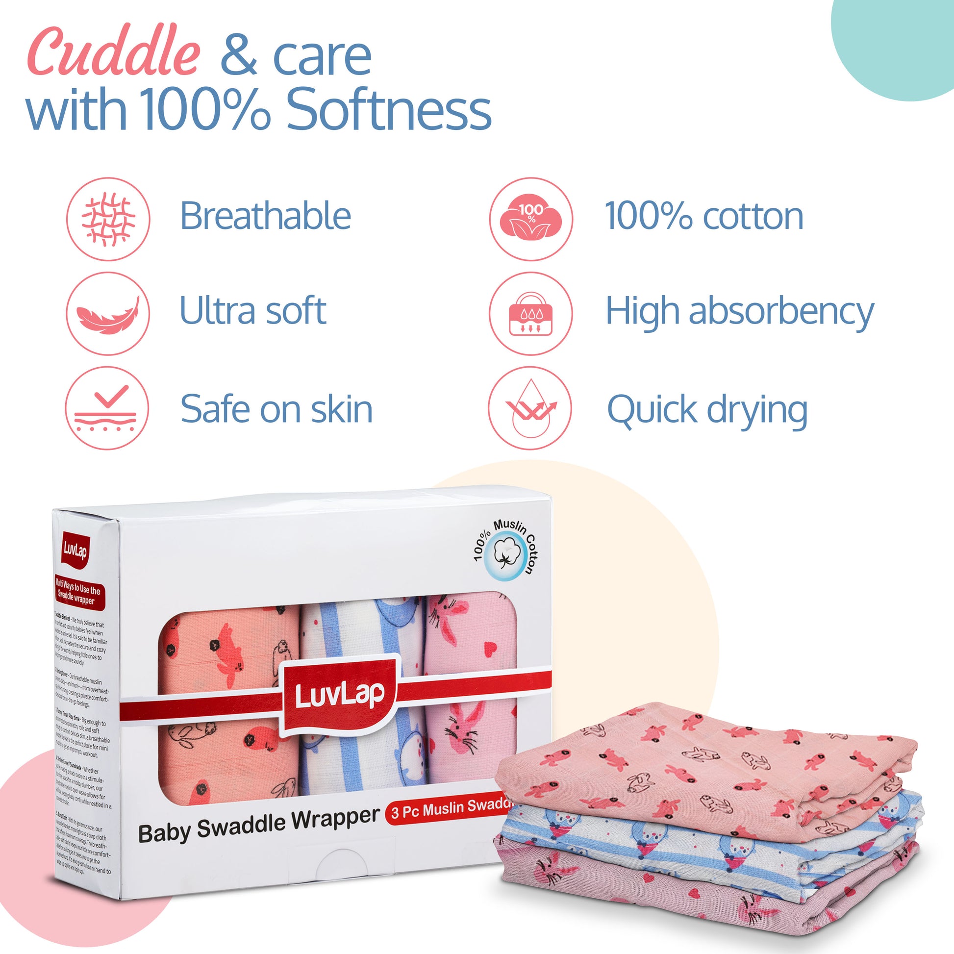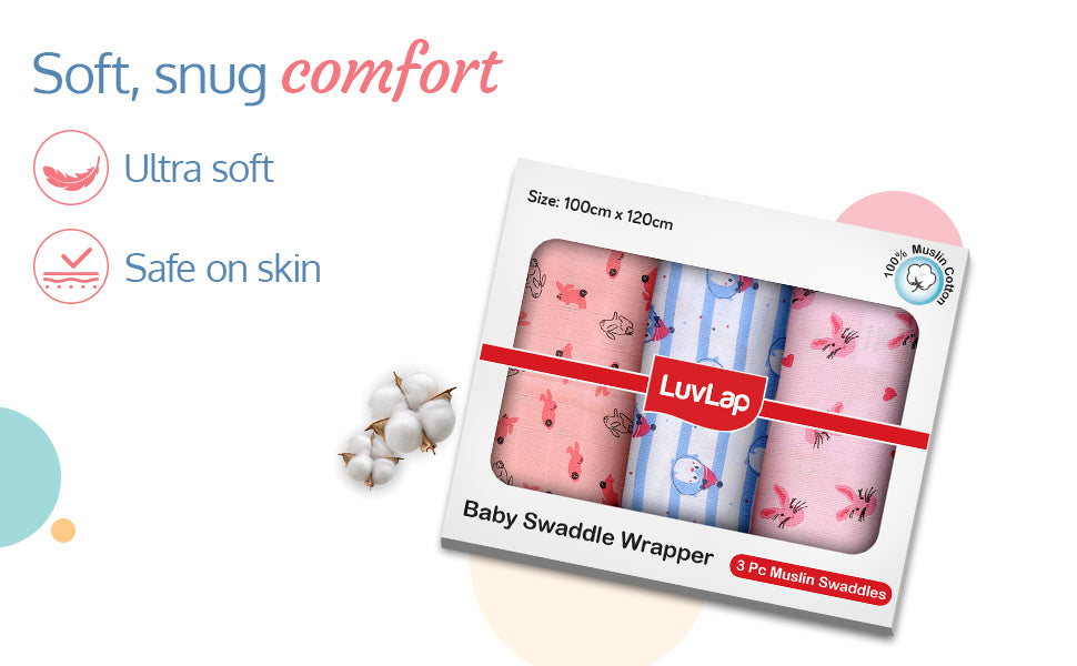 LuvLap is committed to your baby's comfort and joy. LuvLap's range of Baby Swaddles gives your newborn a snug, cozy, womb-like feeling! Made of premium cotton muslin, the swaddles are breathable, prewashed, ultra-soft, and softer with every wash. Free from harmful chemicals, safe and irritant-free for your baby's most sensitive and tender skin. This is lightweight, perfectly sized for swaddling, and can serve multiple uses - burp cloth, towel, stroller cover, play mat, nursing cover, etc.