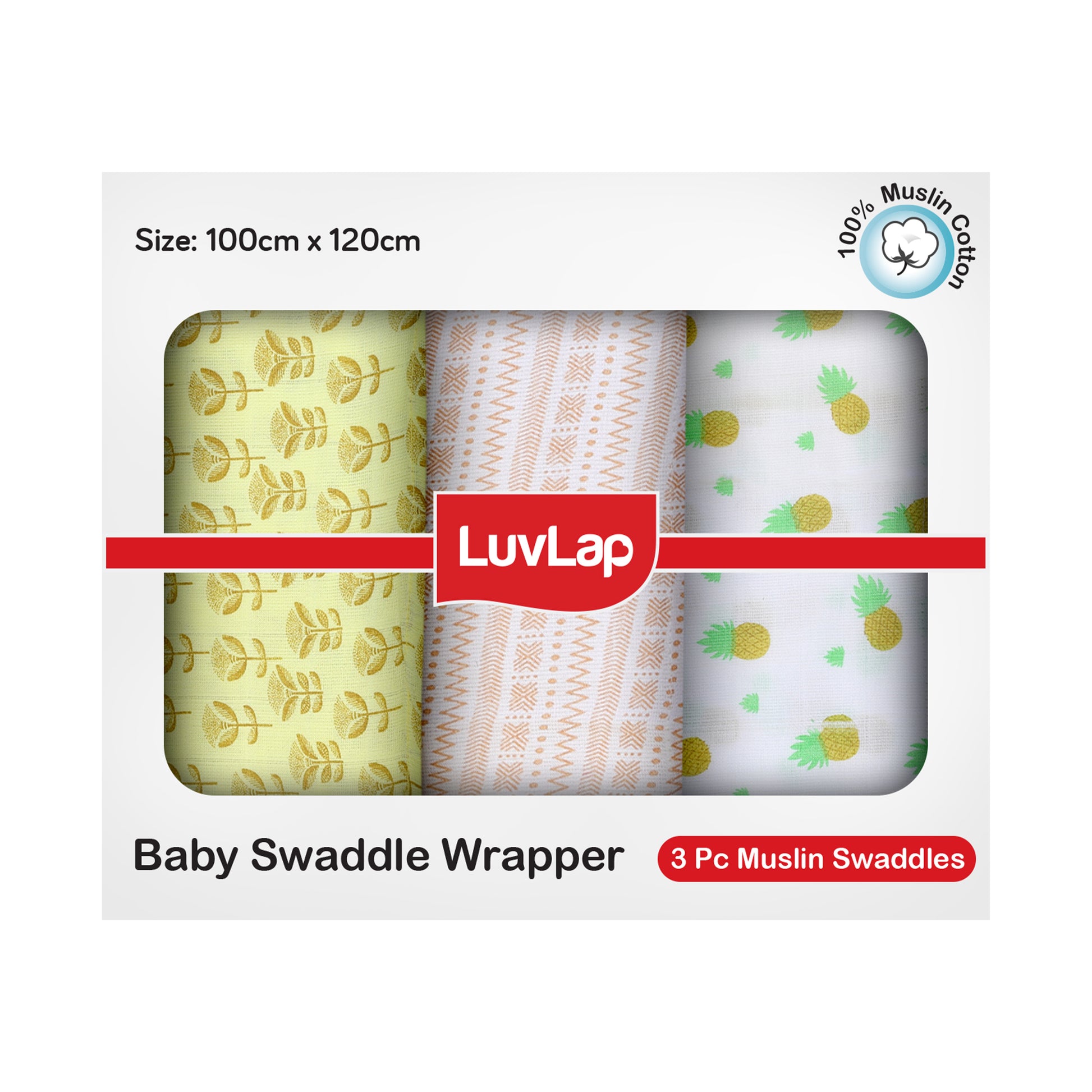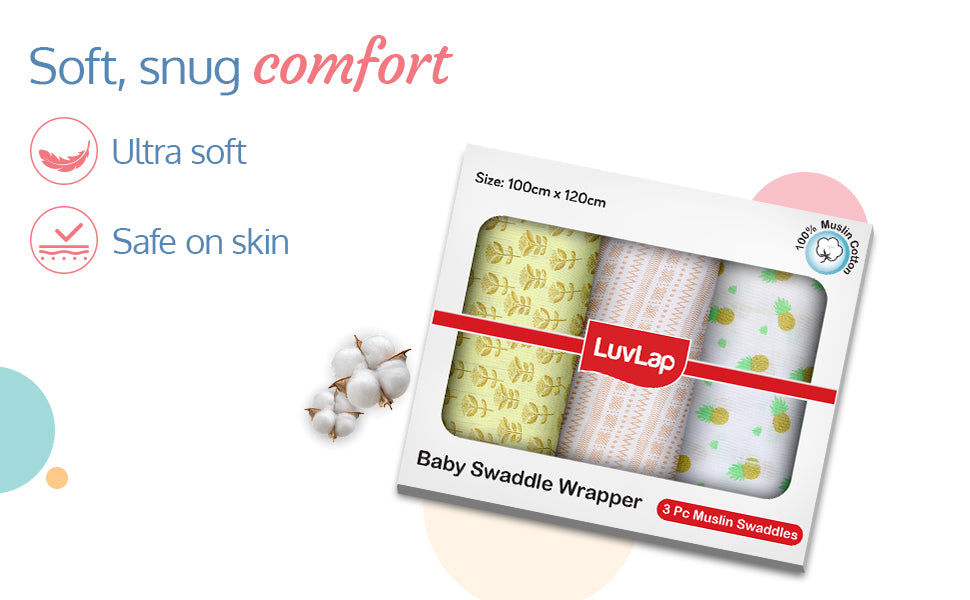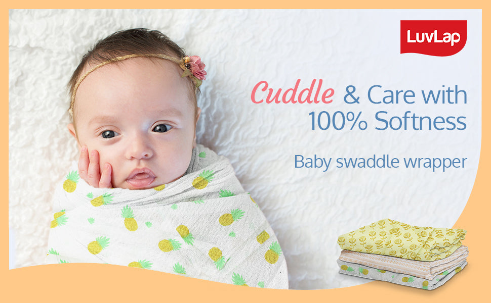 LuvLap is committed to your baby's comfort and joy. LuvLap's range of Baby Swaddles gives your newborn a snug, cozy, womb-like feeling! Made of premium cotton muslin, the swaddles are breathable, prewashed, ultra-soft, and softer with every wash. Free from harmful chemicals, safe and irritant-free for your baby's most sensitive and tender skin. This is lightweight, perfectly sized for swaddling, and can serve multiple uses - burp cloth, towel, stroller cover, play mat, nursing cover, etc.