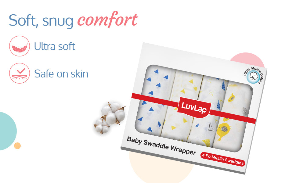 - Baby swaddle pack of 4: Swaddle size 120cm x 100cm. 100% cotton muslin, super soft, comfortable & breathable fabric. Gets softer with every wash. Better airflow ensures that baby isn't overheated