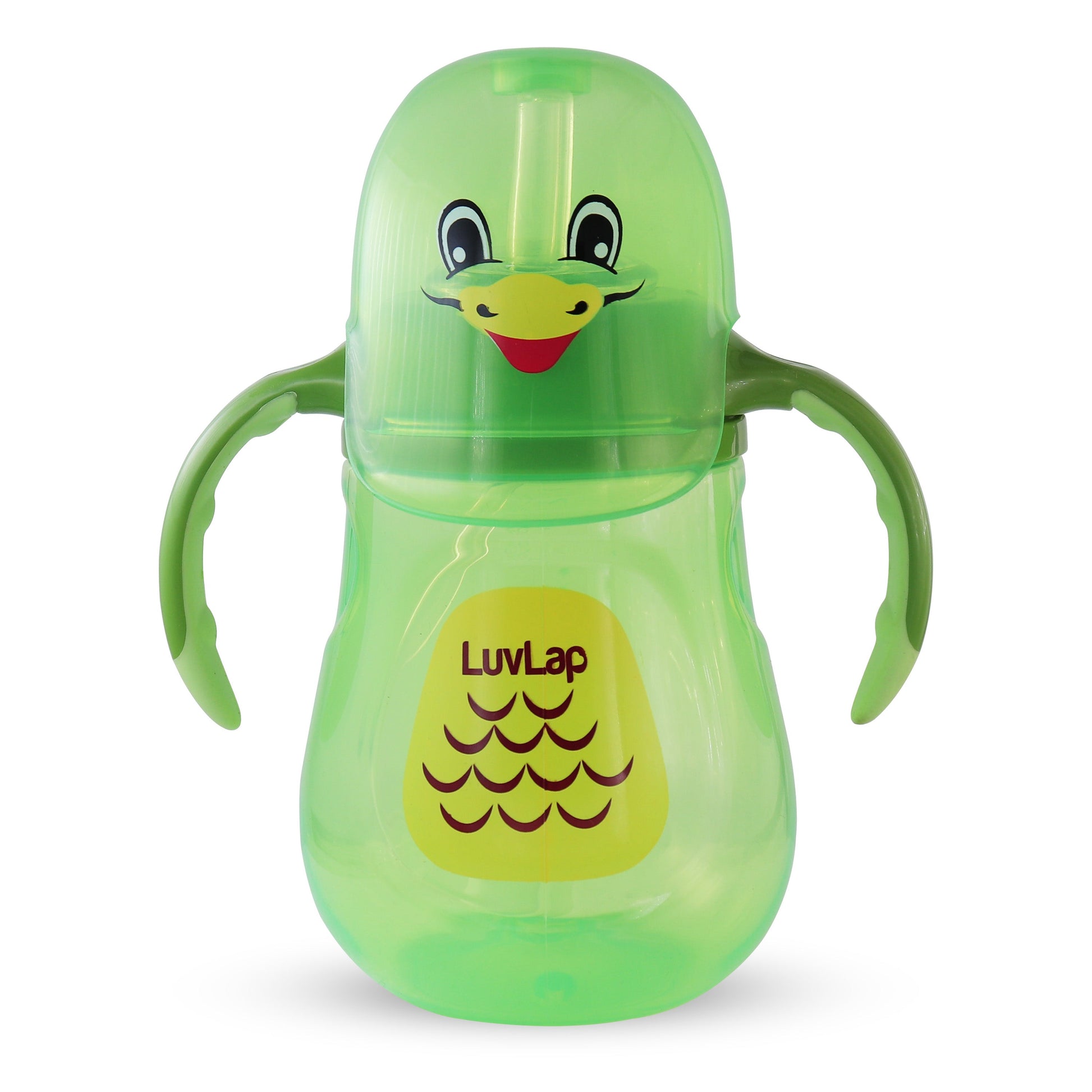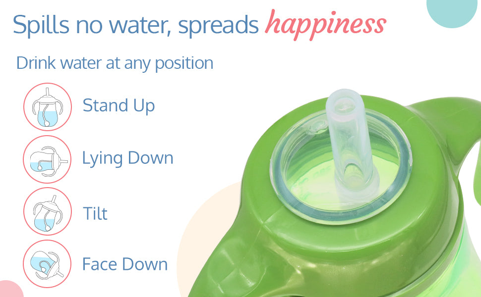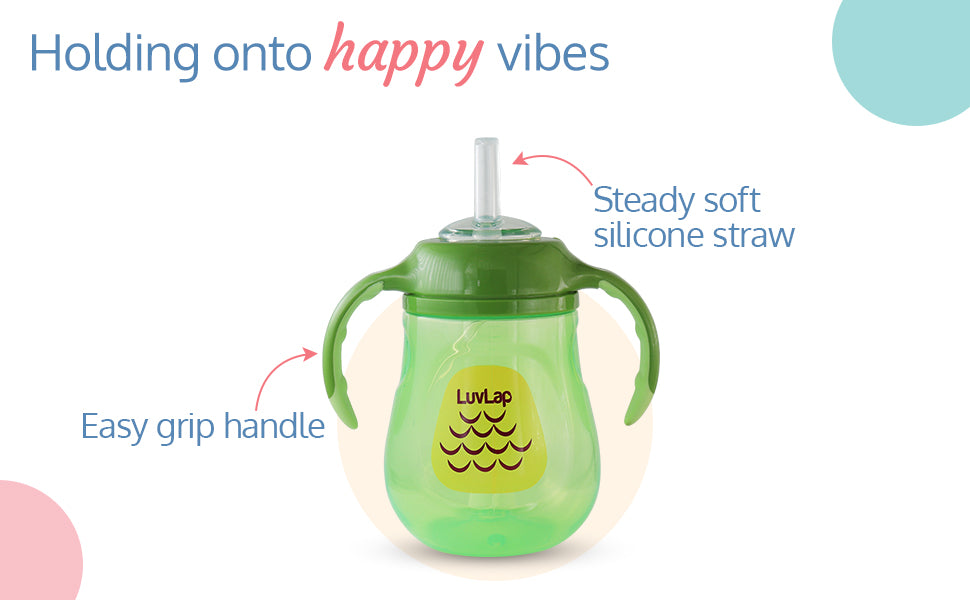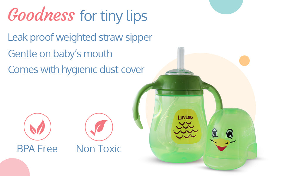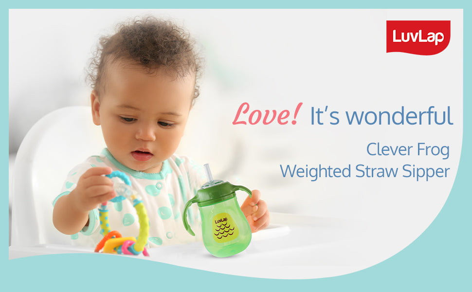 LuvLap Clever Frog Straw Sipper comes with a spill proof weighted straw. It allows child to drink at any angle easily. Ergonomically designed easy grip handles are specially designed as per requirement of small baby hands.