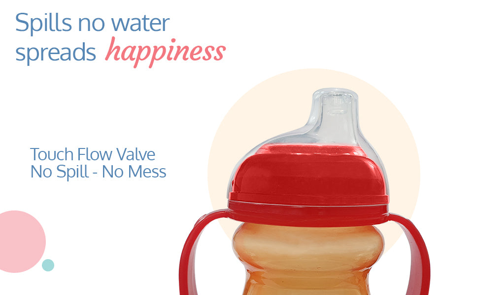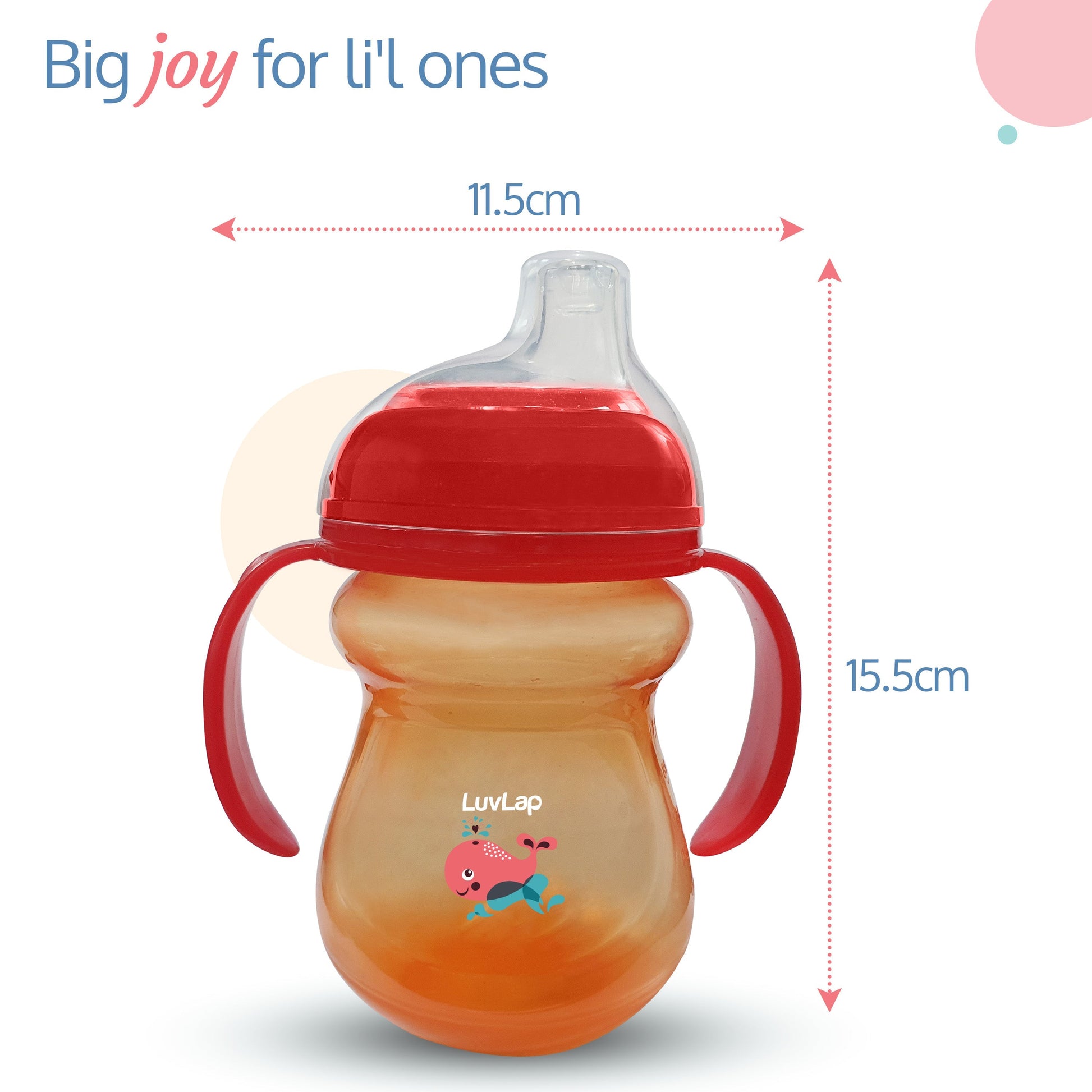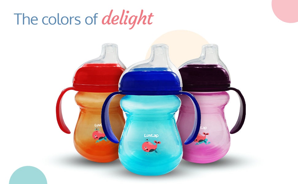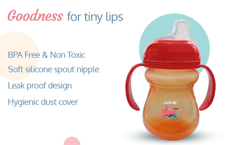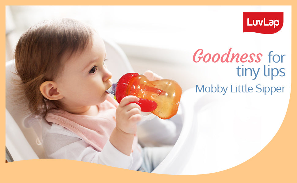 LuvLap Mobby Little Sipper helps through baby's transition stages to drink independently. It comes with a soft silicone spout that is bite resistant. Built in touch-flow valve allows baby led drinking and helps avoid any spills or mess. All parts are sterilizer safe and BPA free