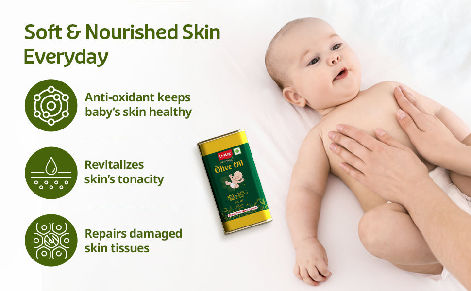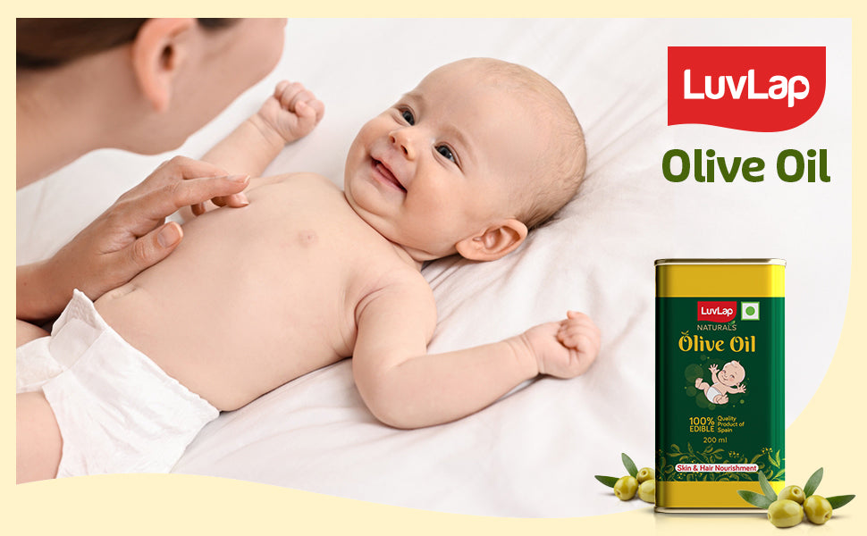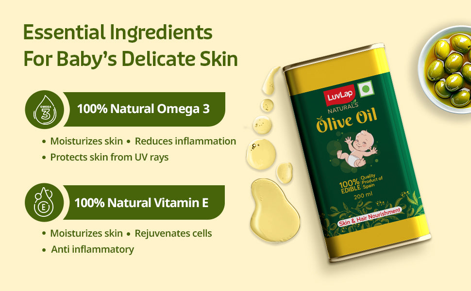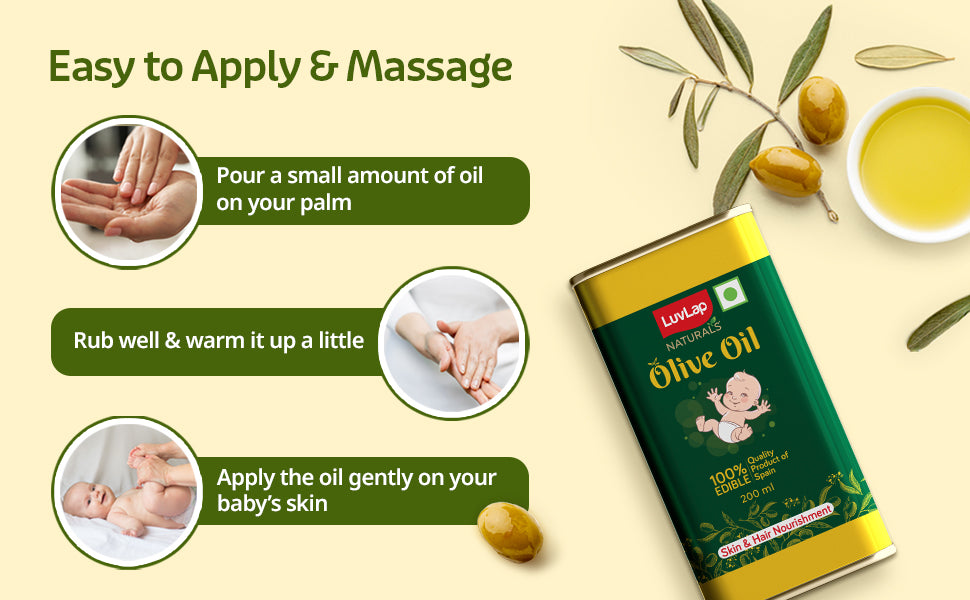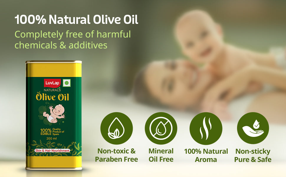 - LuvLap Naturals baby body massage oil contains 100% edible Olive oil, extracted from Spanish Olive that enhances your baby's bone & muscle strength, stimulate blood circulation.