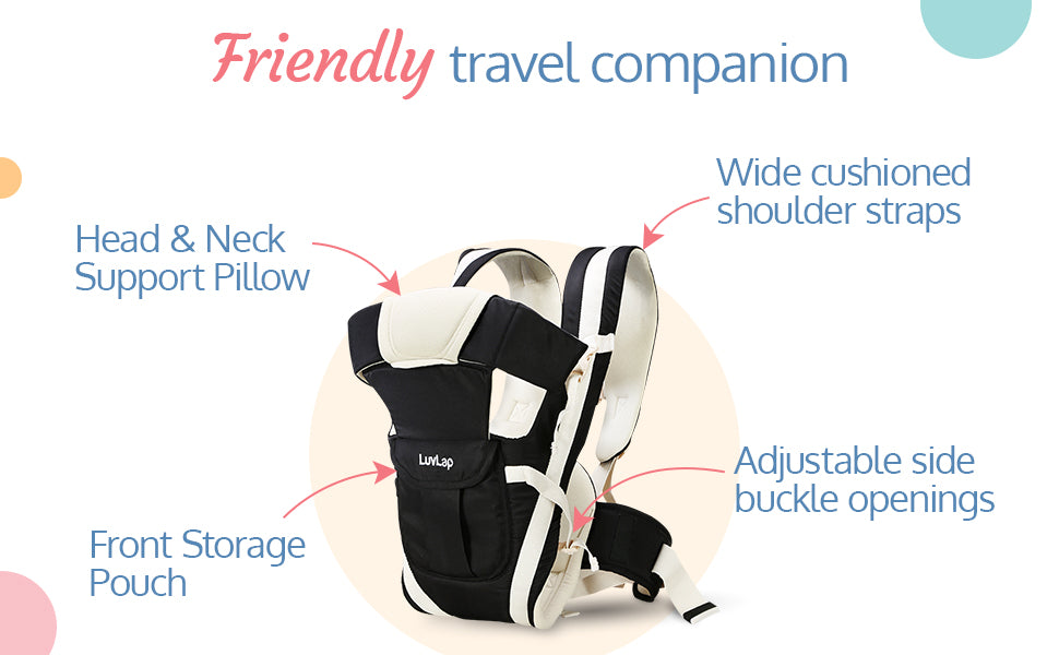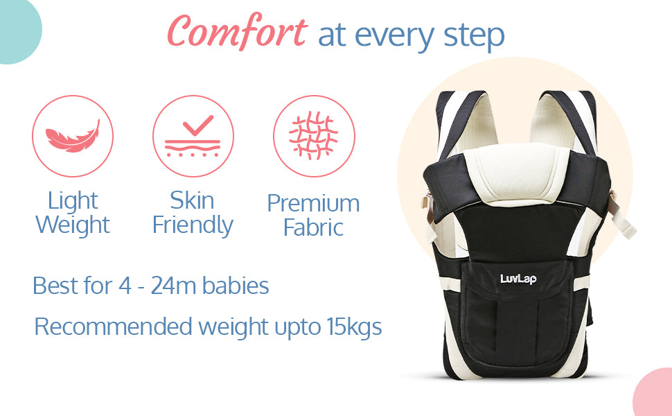 Now take your baby out of the house without any hassle or worries in this convenient LuvLap baby carrier. It is great for your baby to explore the surroundings safely while feeling emotionally secure. Made of premium quality breathable fabric, with multi carrying positions and adjustable belts make sure both baby and parent is most comfortable. Close carrying has been scientifically proven to help your baby grow up to be secure, intelligent, family oriented and happy. So whether it is to do small chores or to meet friends, you can take your baby out with you every time.