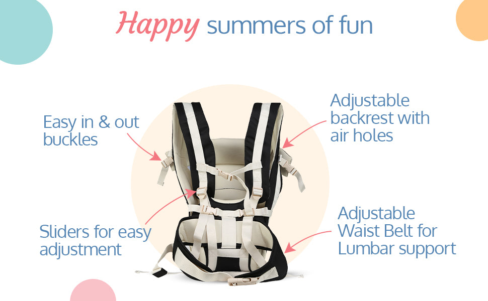 - Adjustable side opening buckles and cushioned leg holes ensure safety and comfort. Front storage pocket on waist belt to store pacifier or other essentials