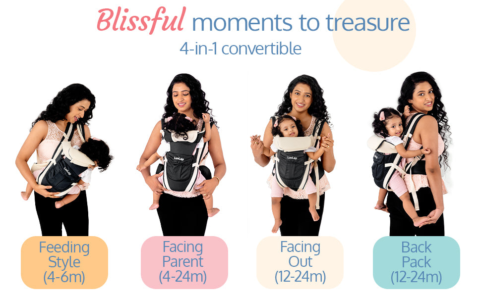 - This baby carrier can be used in 4 carrying positions – Feeding style, Front carry facing parent, Front carry facing out & Back carry options provide ergonomic positions for comfortable carrying