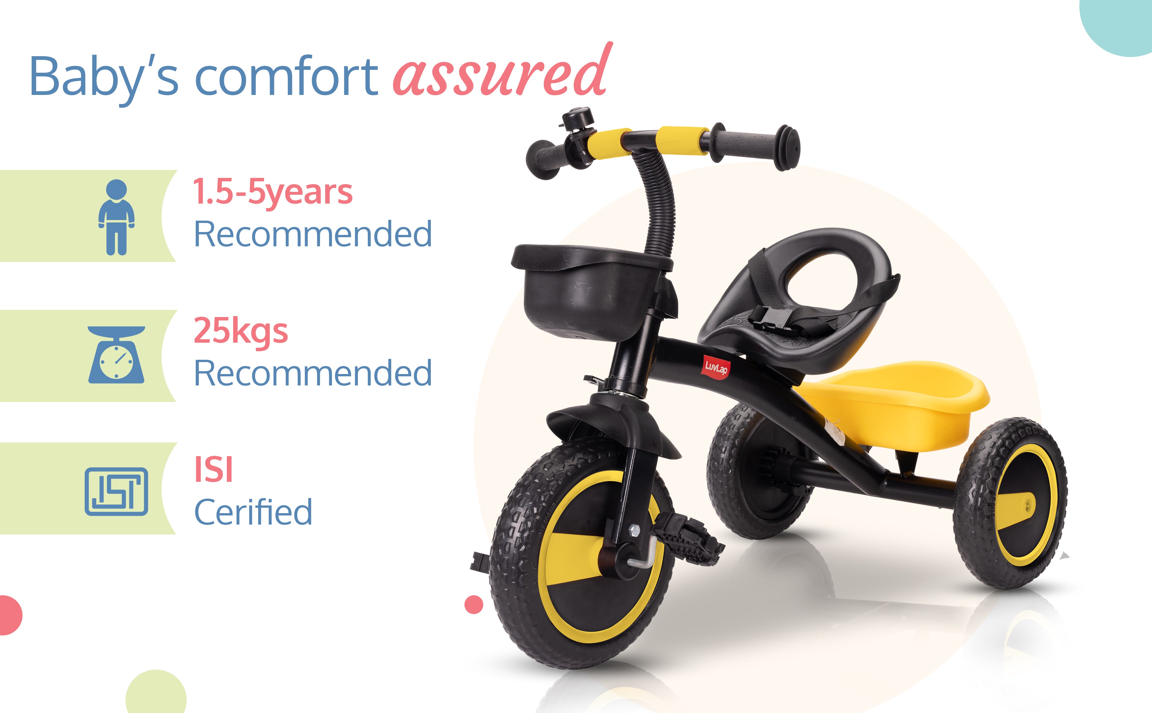 - Grows with your Baby: The tricycle has Spacious seat with 2 position Adjustment, Can be used for kids of 1.5 years to 5 years, supports maximum weight of 25 kgs
