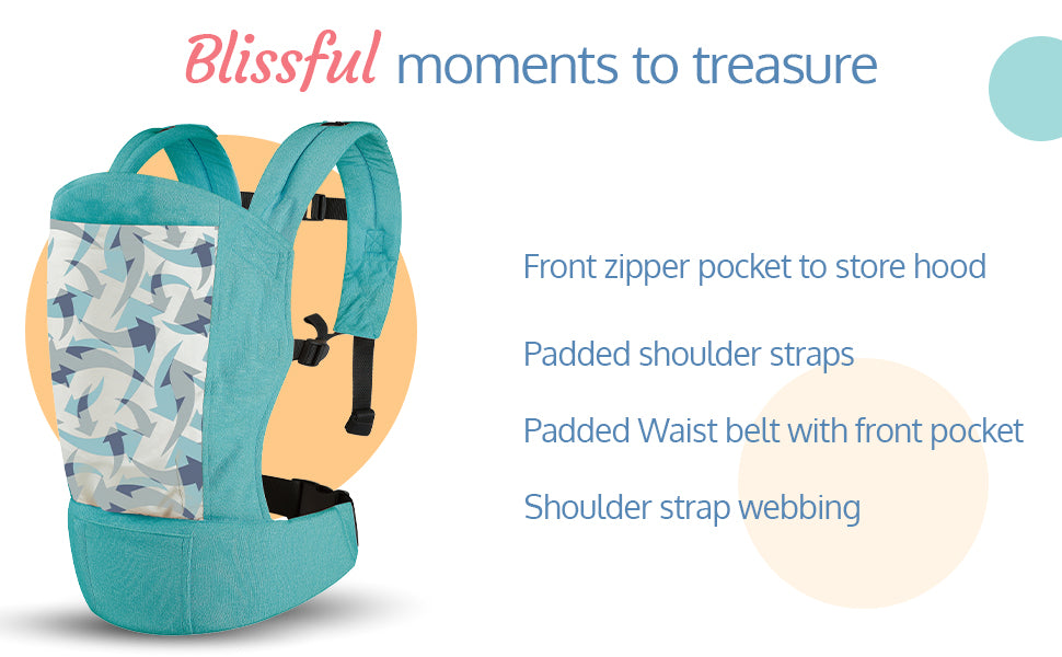 - Integrated sleeping hood in zipper pocket. Front storage pocket on waist belt to store pacifier or other essentials
