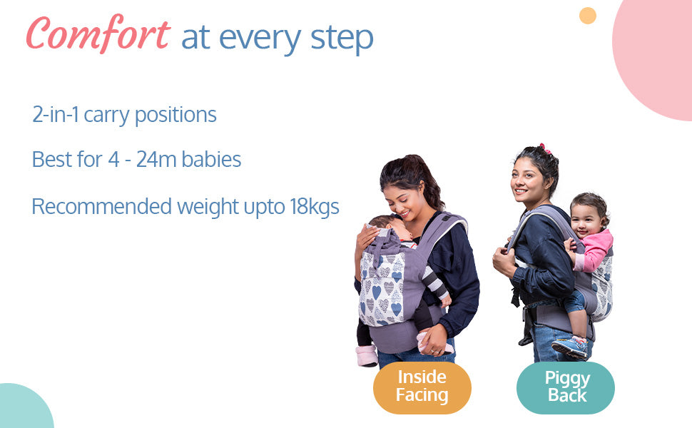 - 2 carrying positions – Front carry and Back carry options to provide a natural, ergonomic position best for long term, comfortable carrying