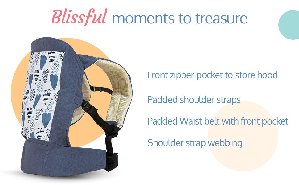 - Integrated sleeping hood in zipper pocket. Front storage pocket on waist belt to store pacifier or other essentials