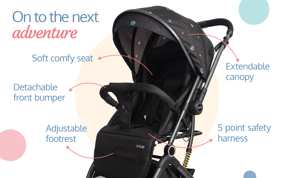 - 5 point safety harness for child safety, Extended Foldable Canopy for maximum comfort