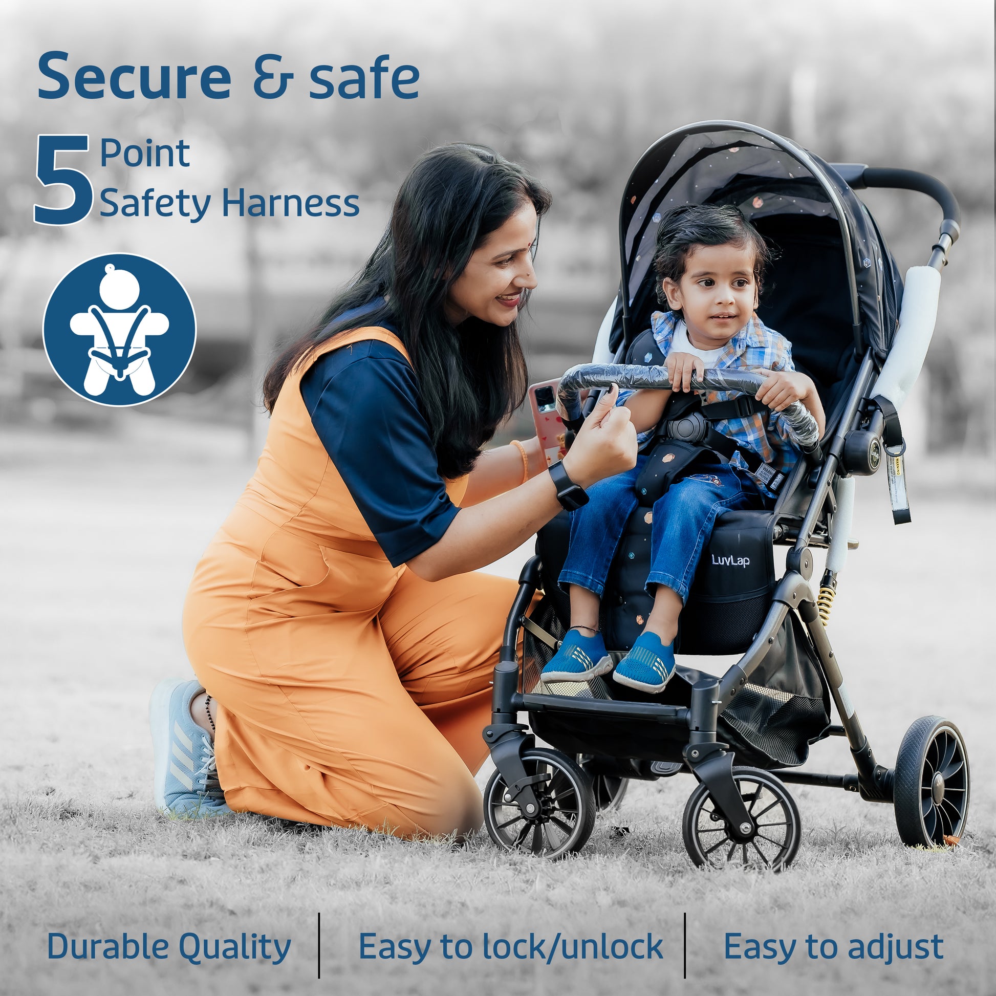 - 5 point safety harness for child safety, Extended Foldable Canopy for maximum comfort