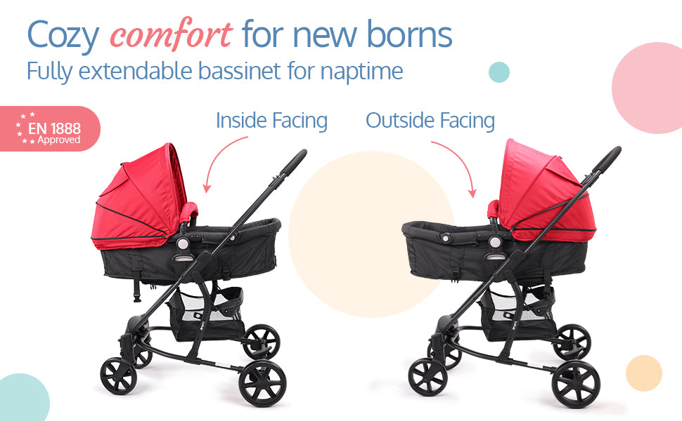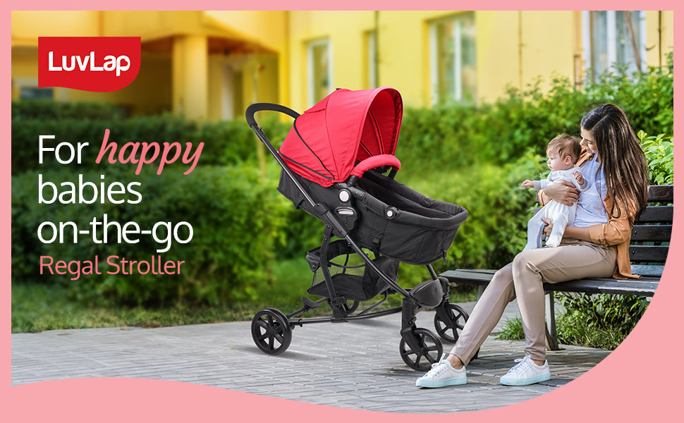 LuvLap Regal Baby Stroller / Pram is a rversible stroller. The stroller is certified as per Safety Standards EN1888. It comes with 5 point Safety Harness for safety. For maximum comfort of your baby there are multiple features like extended Canopy, Multiple level recline.