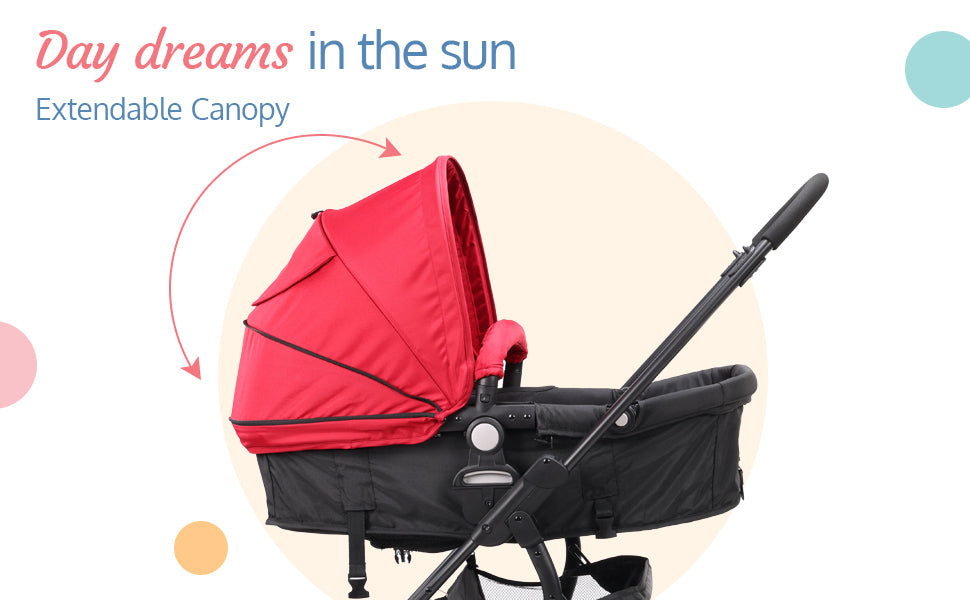 - Ensures maximum comfort with Multi-position seat recline, Spacious cushioned seat, Extendable canopy & Adjustable footrest