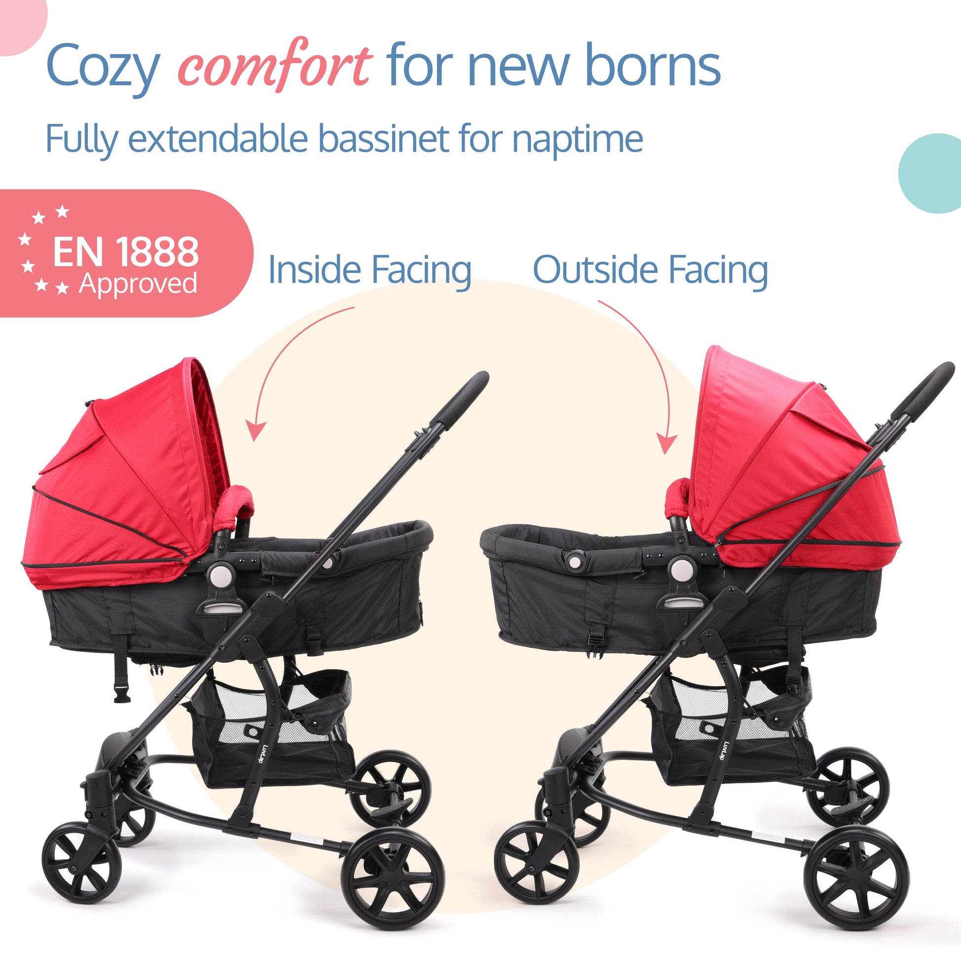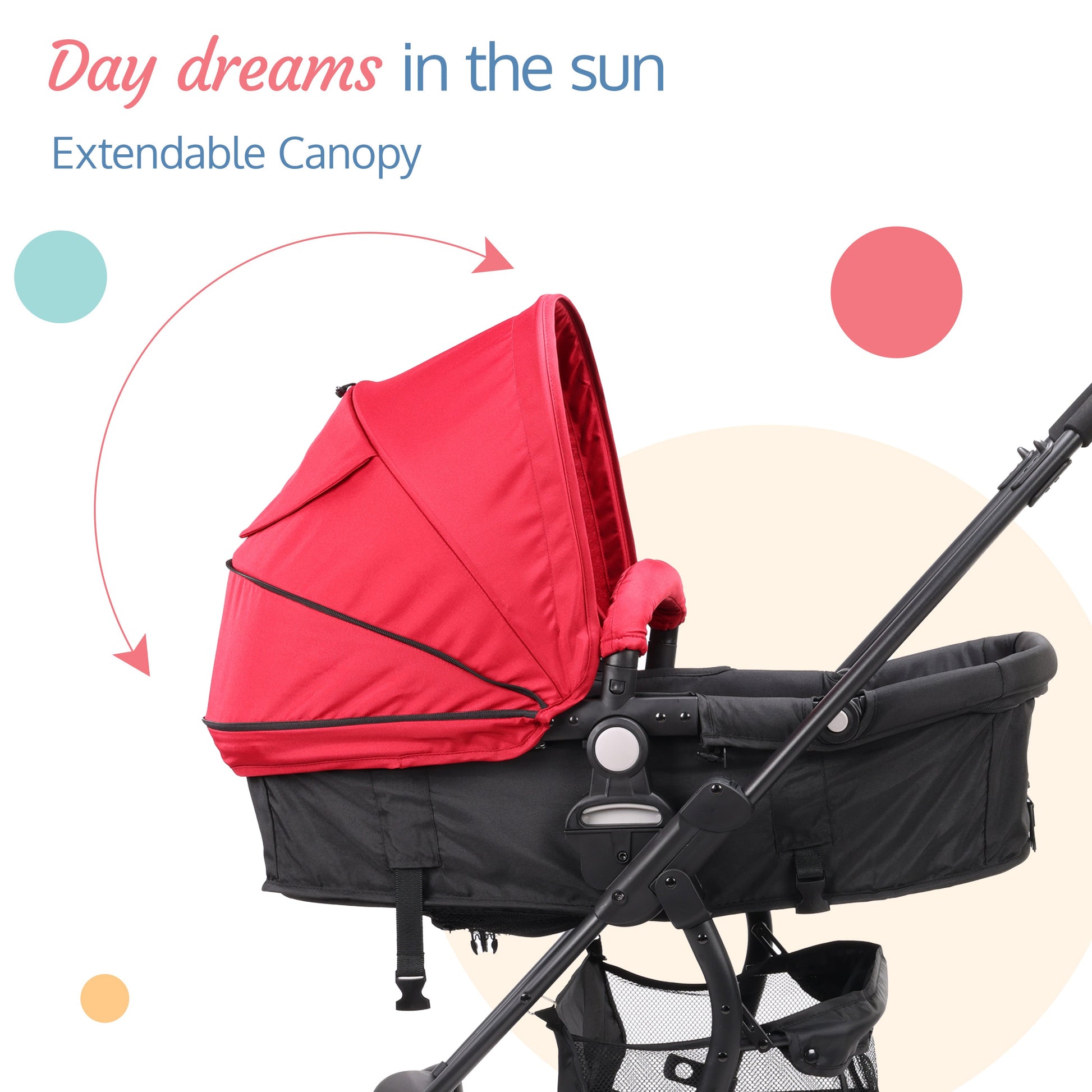 Alpha Baby Stroller/Pram, One Fold, Travel Friendly, 5 Point Safety Harness, Reversible Handle bar, Multilevel Recline & Adjustable footrest, Extendable Canopy, for Babies 0-3 Years (Red)
