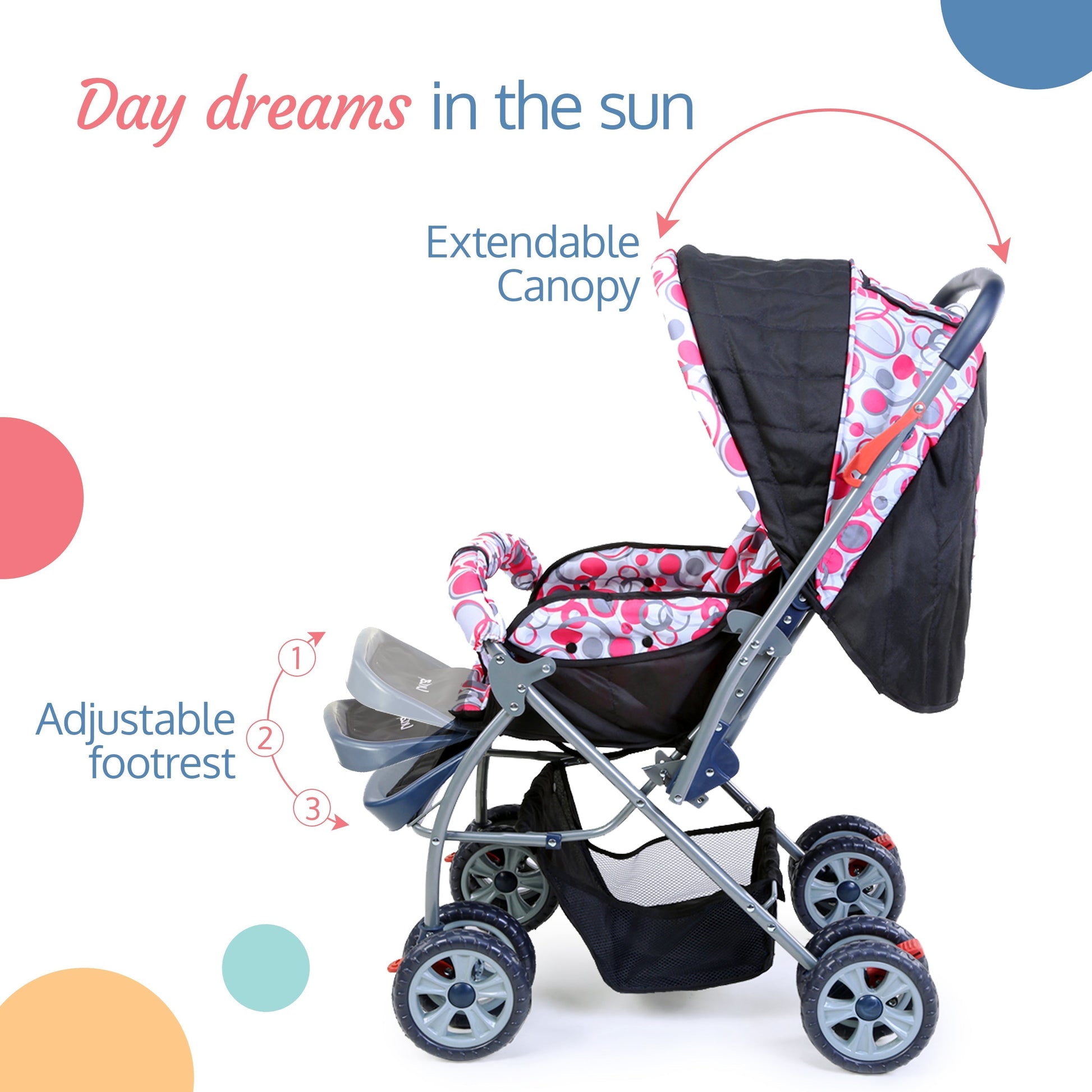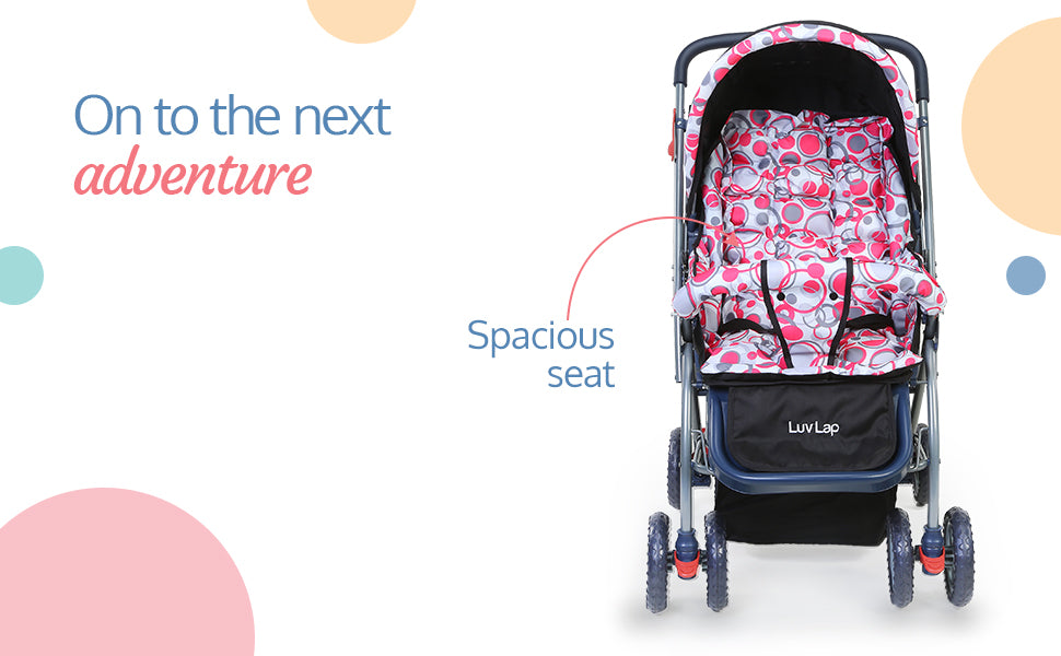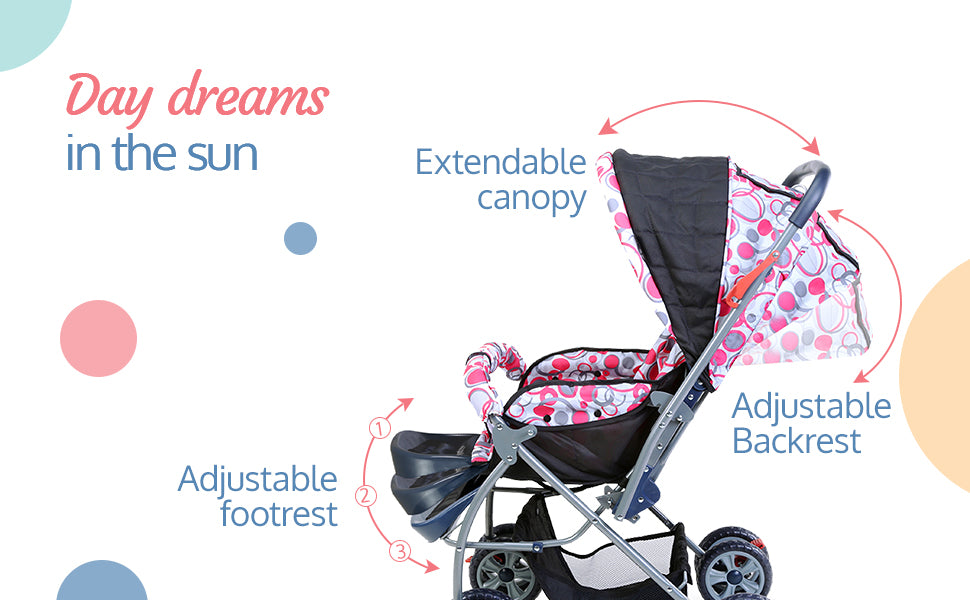 - Comfort Ensured : 3 position Seat recline so that baby can sit, relax or sleep inside the stroller. Cushioned seat & Adjustable footrest adds to baby's comfort. Double layred canopy saves the baby from harsh sunlight.