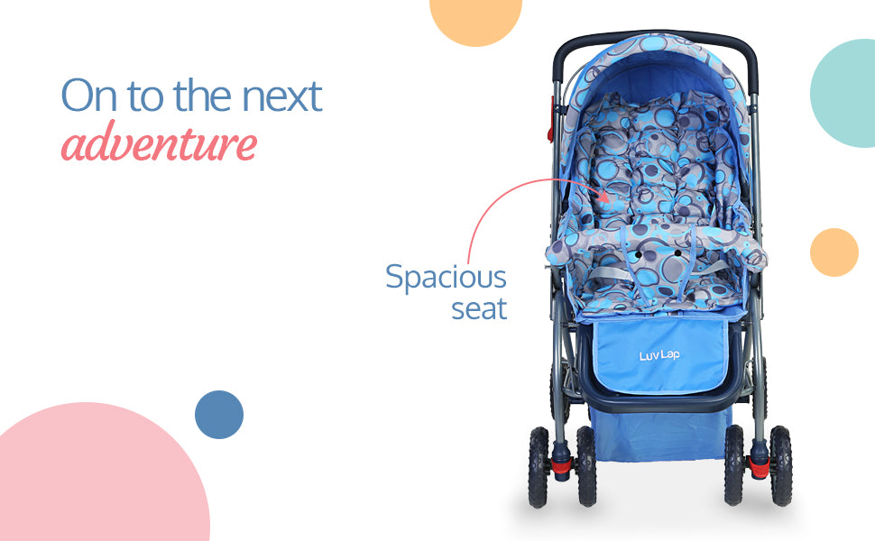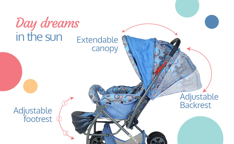 - Comfort Ensured : 3 position Seat recline so that baby can sit, relax or sleep inside the stroller. Cushioned seat & Adjustable footrest adds to baby's comfort. Double layred canopy saves the baby from harsh sunlight.
