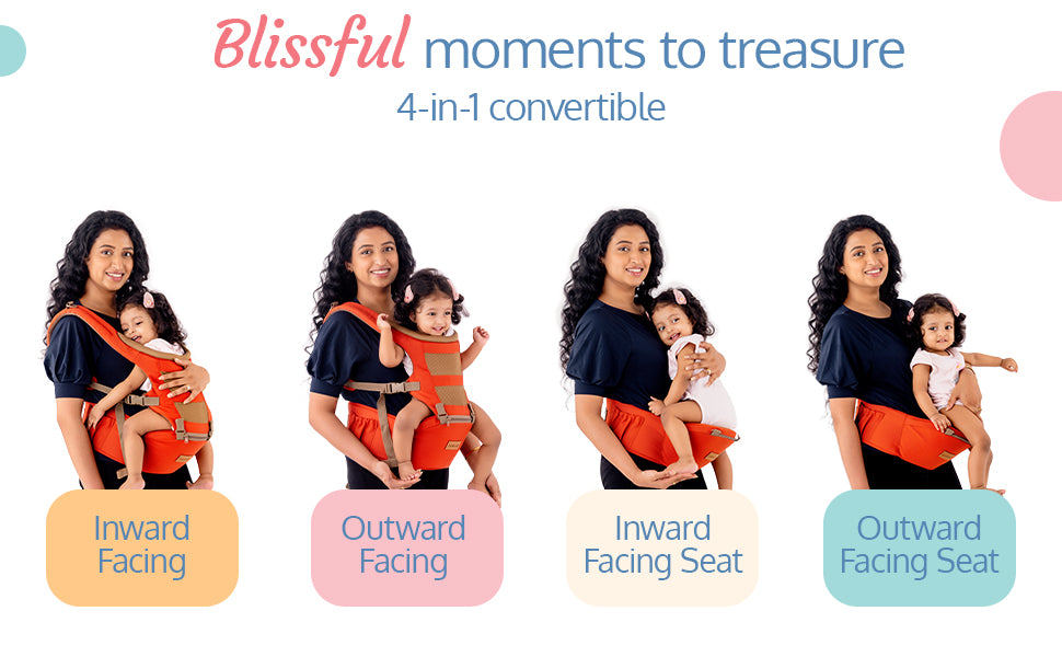 - 4 carrying positions – Front carry facing parent, Front carry facing out, Front carry baby seat facing parent and Front carry baby seat facing out provides ergonomic positions for comfortable carrying