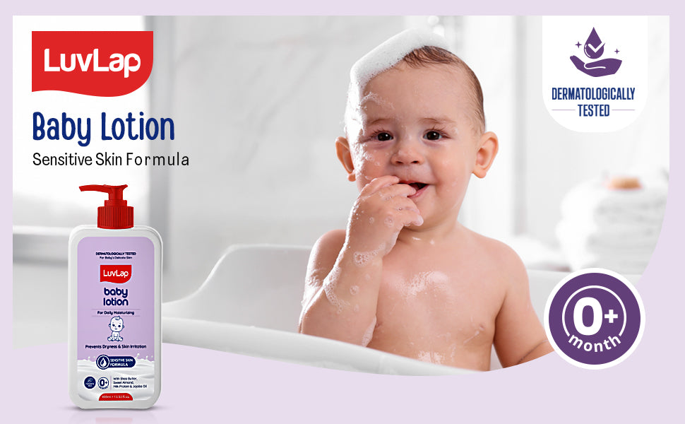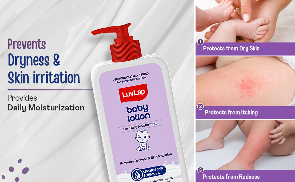 Keep your baby’s skin soft, nourished, and protected all day with LuvLap Baby Lotion. Enriched with Milk Protein, Shea Butter, Sweet Almond Oil, and Vitamin E, this gentle formula is specially crafted for your little one’s delicate and sensitive skin. It offers 24-hour hydration, ensuring lasting moisture and comfort.