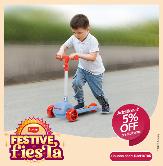 LuvLap Baby Scooters are designed to provide fun, safe, and active play for toddlers. These scooters feature a sturdy build, ergonomic design, and vibrant colors, ensuring both durability and aesthetic appeal. With 3 Shock-Absorbing wheels, Easy to balance, extra wide deck, Lightweight design and easy maneuverability, they support the development of balance and coordination skills. LuvLap prioritizes safety, incorporating Wide front & rear wheels, with very good grip. Luvlap baby scooters buy online which promote physical activity and offer a thrilling riding experience for young children, making them an excellent choice for parents seeking quality and excitement in their child's outdoor play.