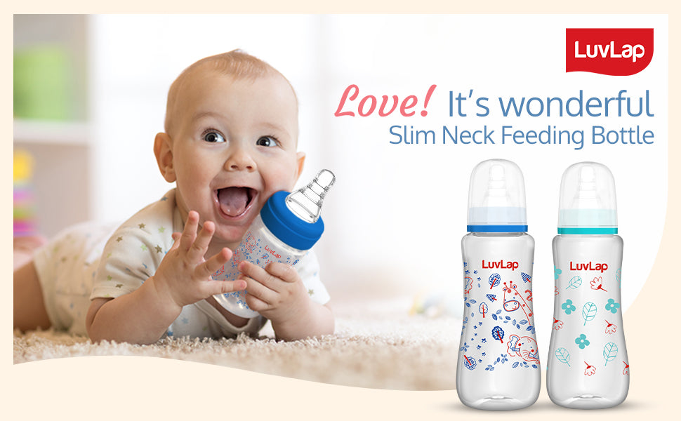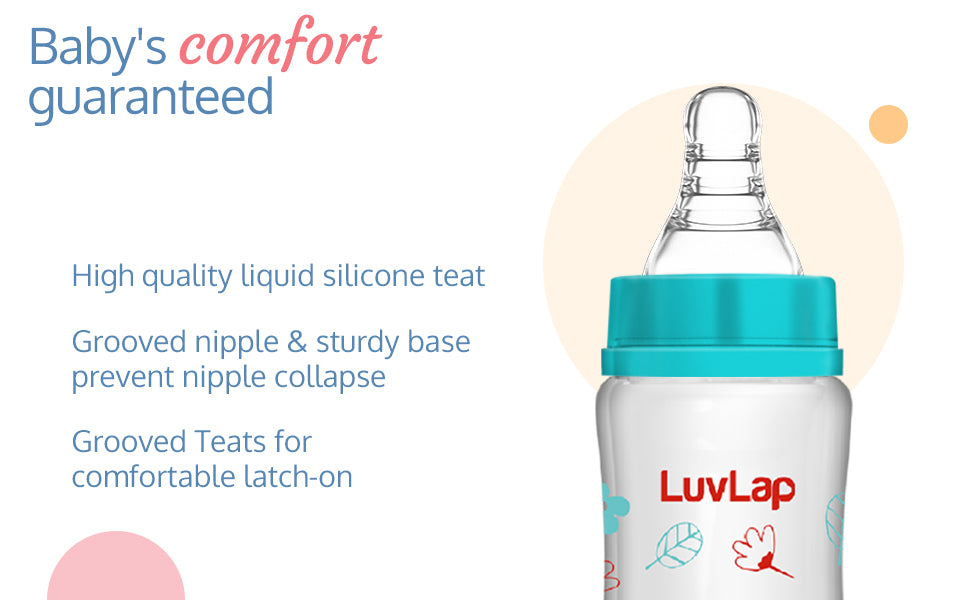 LuvLap Essential Feeding Bottles are ergonomically designed to be easily held while feeding the baby. All LuvLap bottles are 100% BPA free and fully sterilizable. The teats are 100% Liquid Silicone and have an anti-colic valve that vents air into the bottle, preventing any air from entering the baby??s tummy. The teat has spiral grooves at the tip, which encourage peristaltic suckling, and help the baby get a comfortable latch. The grooved teats and superior silicone quality ensure no nipple collapse, helping in an uninterrupted feed. With the LuvLap Essential Feeding Bottles at your side, your baby??s feed will always be a comfortable one