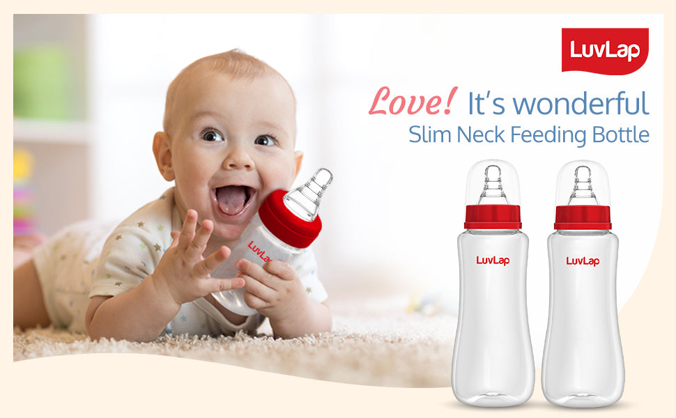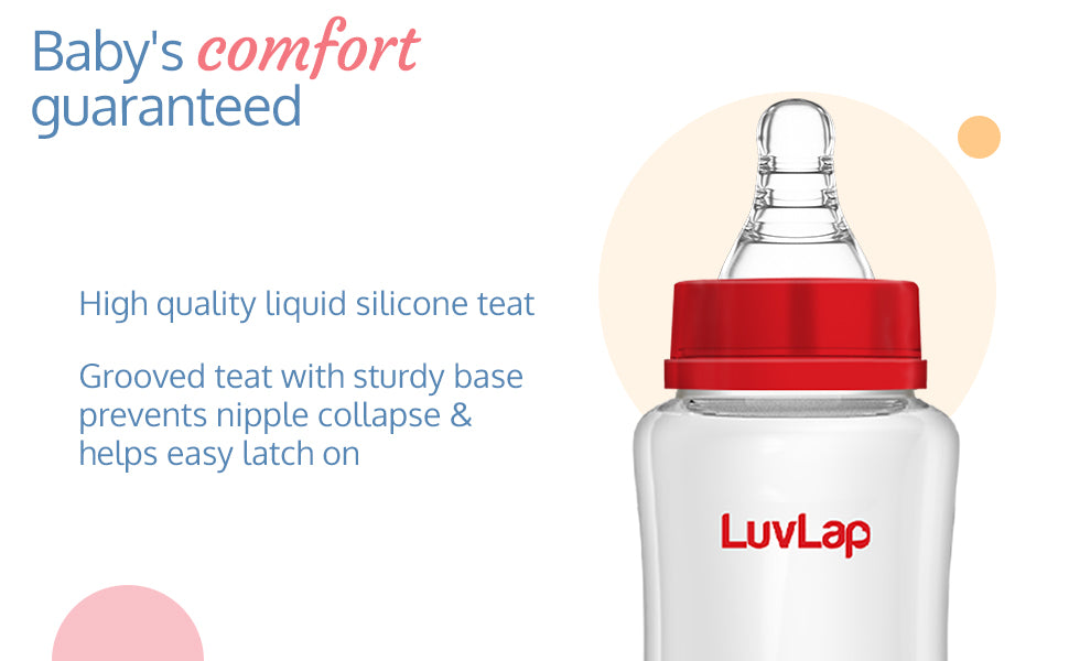 LuvLap Essential Feeding Bottles are ergonomically designed to be easily held while feeding the baby. All LuvLap bottles are 100% BPA free and fully sterilizable. The teats are 100% Liquid Silicone and have an anti-colic valve that vents air into the bottle, preventing any air from entering the baby??s tummy. The teat has spiral grooves at the tip, which encourage peristaltic suckling, and help the baby get a comfortable latch. The grooved teats and superior silicone quality ensure no nipple collapse, helping in an uninterrupted feed. With the LuvLap Essential Feeding Bottles at your side, your baby??s feed will always be a comfortable one