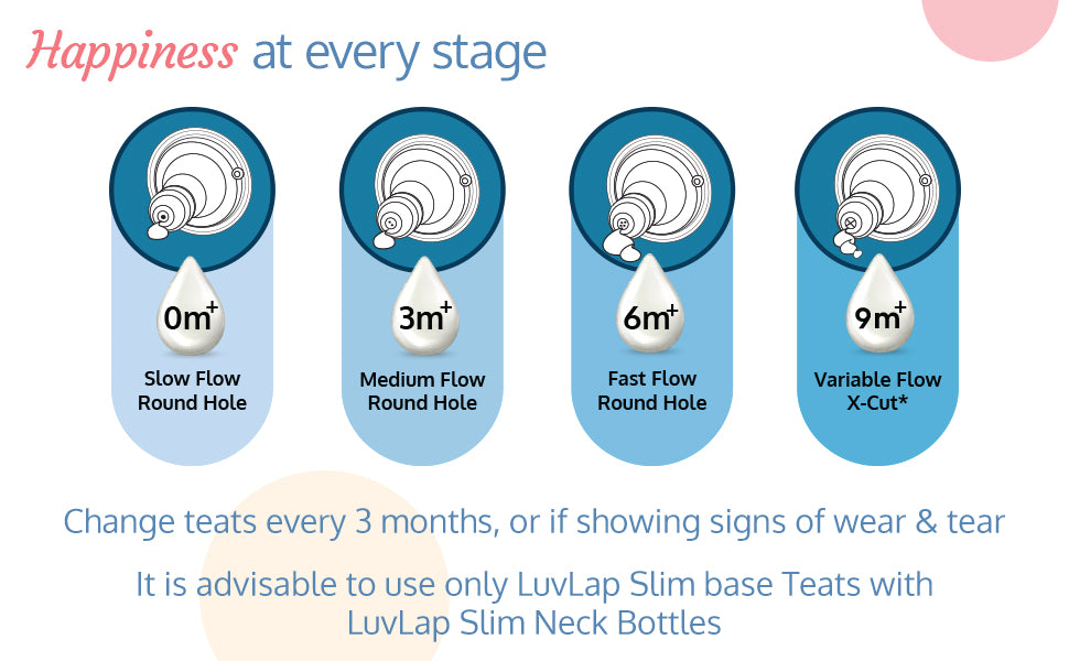 The LuvLap Essential teats are 100% Liquid Silicone and have an anti-colic valve that vents air into the bottle, preventing any air from entering the baby's tummy. The teat has spiral grooves at the tip, which encourage peristaltic suckling, and help the baby get a comfortable latch, ensuring a stress-free feed every time. The grooved teats and superior silicone quality ensure no nipple collapse, helping in an uninterrupted feed.
