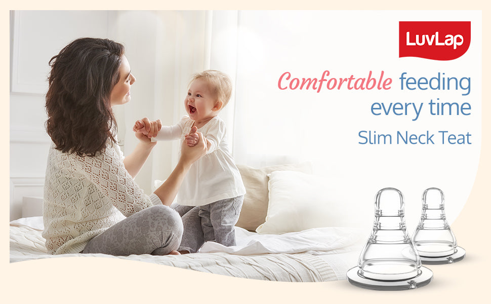 The LuvLap Essential teats are 100% Liquid Silicone and have an anti-colic valve that vents air into the bottle, preventing any air from entering the baby's tummy. The teat has spiral grooves at the tip, which encourage peristaltic suckling, and help the baby get a comfortable latch, ensuring a stress-free feed every time. The grooved teats and superior silicone quality ensure no nipple collapse, helping in an uninterrupted feed.