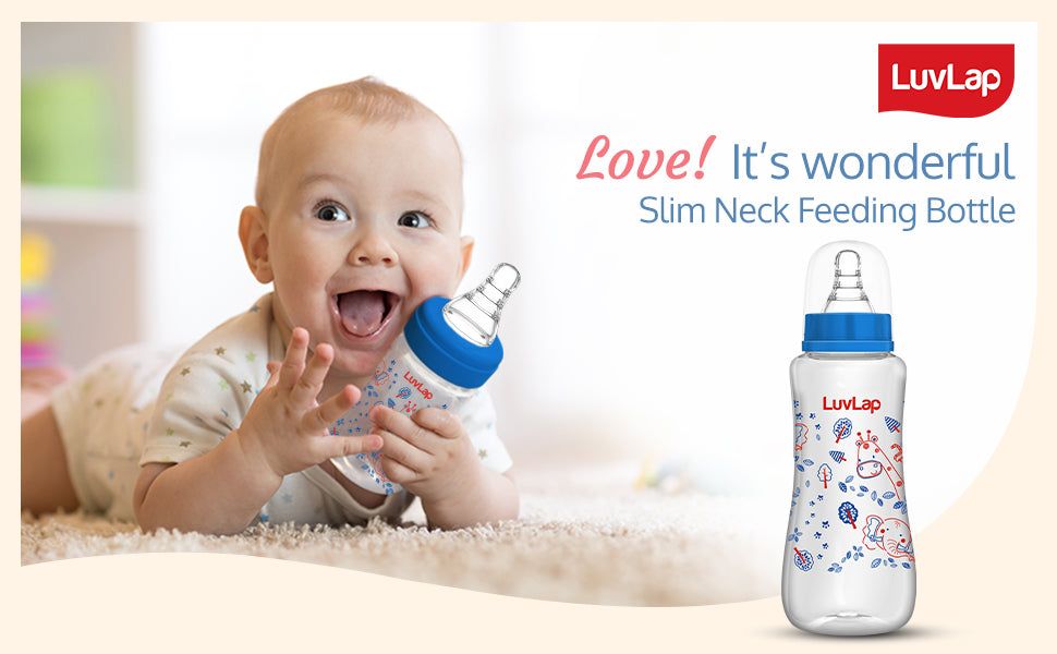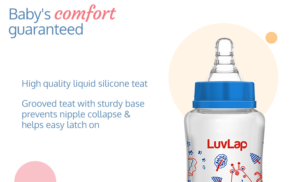 LuvLap Essential Feeding Bottles are ergonomically designed to be easily held while feeding the baby. All LuvLap bottles are 100% BPA free and fully sterilizable. The teats are 100% Liquid Silicone and have an anti-colic valve that vents air into the bottle, preventing any air from entering the baby's tummy. The teat has spiral grooves at the tip, which encourage peristaltic suckling, and help the baby get a comfortable latch. The grooved teats and superior silicone quality ensure no nipple collapse, helping in an uninterrupted feed. With the LuvLap Essential Feeding Bottles at your side, your baby's feed will always be a comfortable one