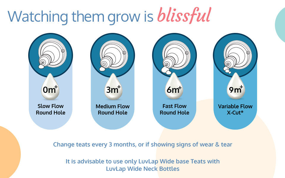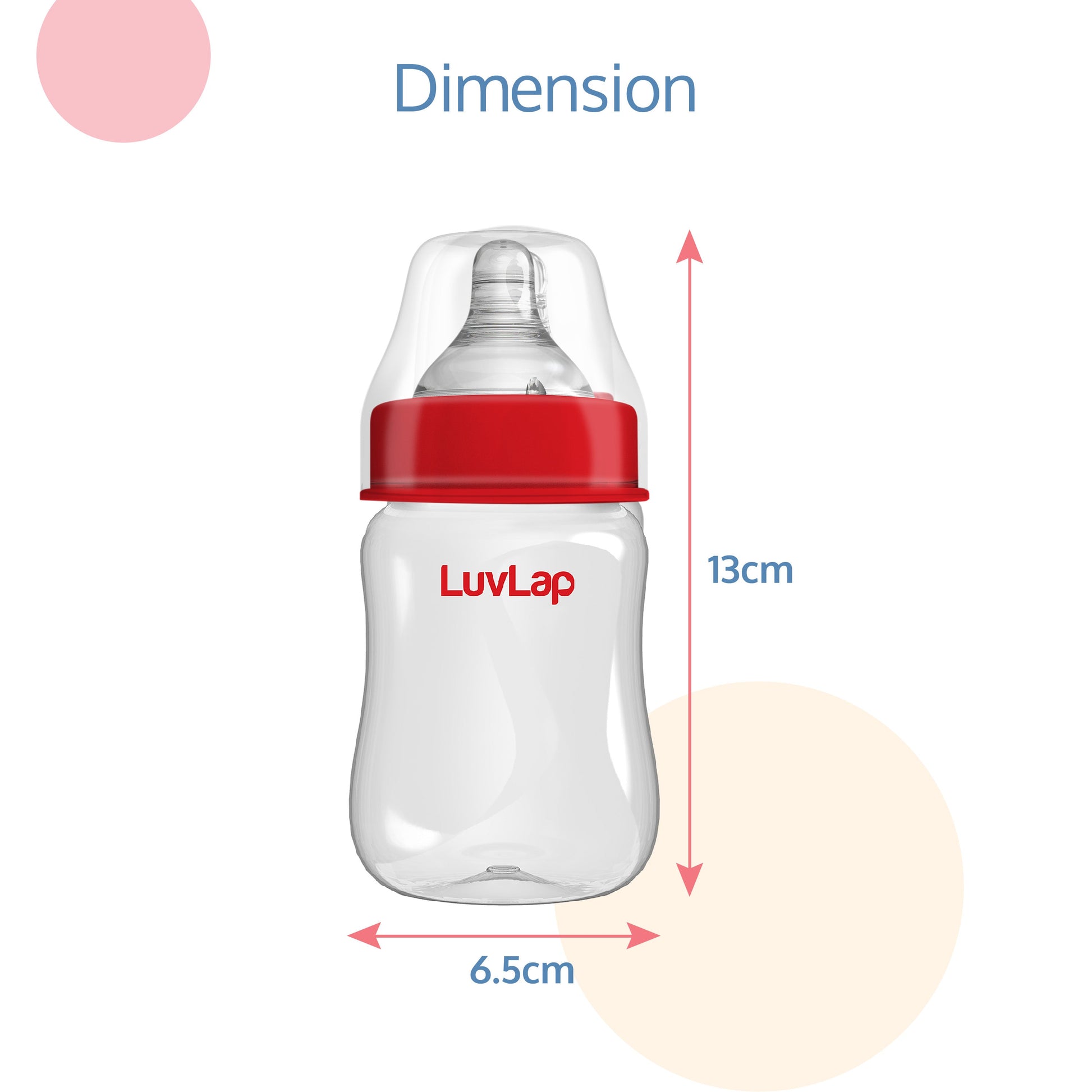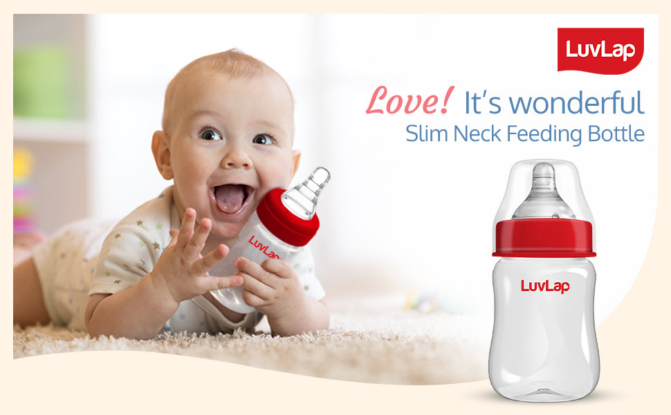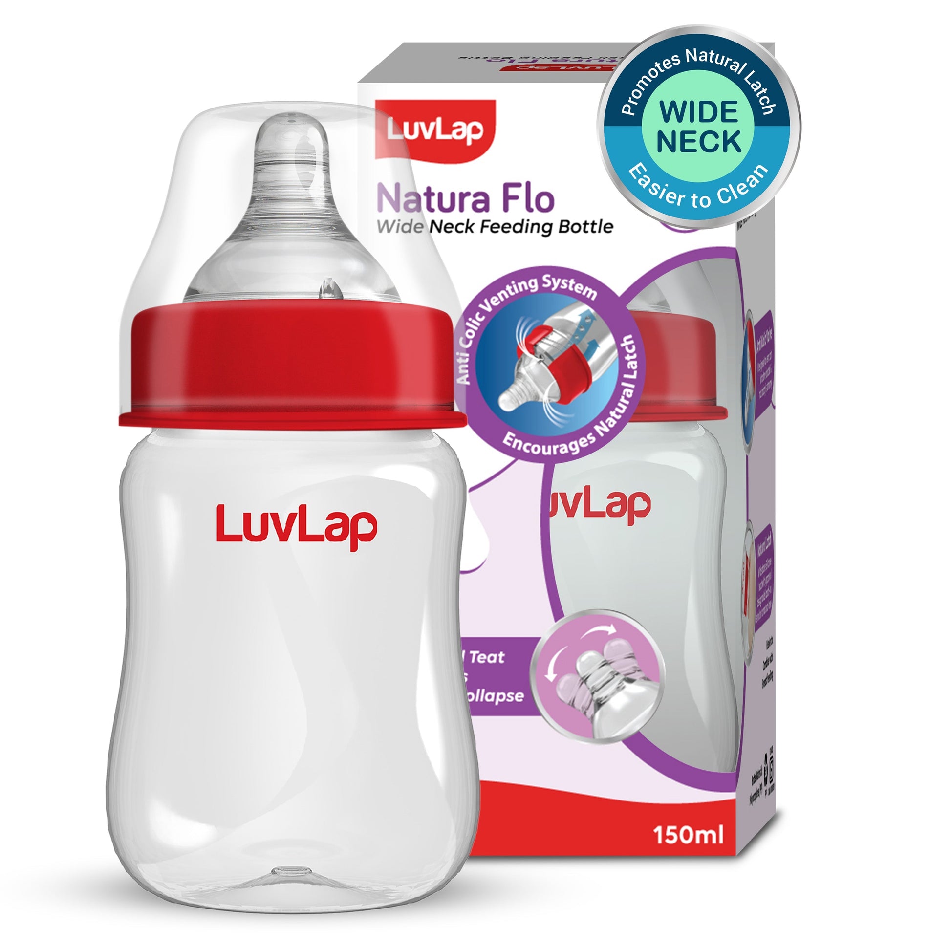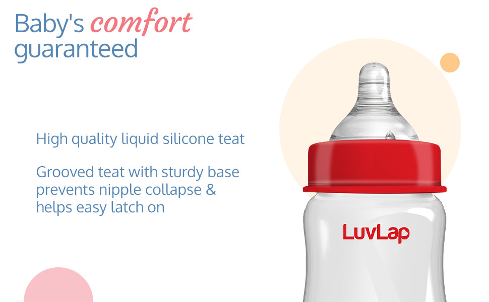 LuvLap Natura Flow Feeding Bottles are ergonomically designed to be easily held while feeding the baby. All LuvLap bottles are 100% BPA free and fully sterilizable. The teats are 100% Liquid Silicone and have an anti-colic valve that vents air into the bottle, preventing any air from entering the baby??s tummy. The teat has grooves at the tip, which encourage peristaltic suckling, while the wide base helps the baby get a natural latch, similar to that on the mother??s breast. This helps easy transition between breastfeeding & bottle feeding. The grooved teats and superior silicone quality ensure no nipple collapse, helping in an uninterrupted feed.