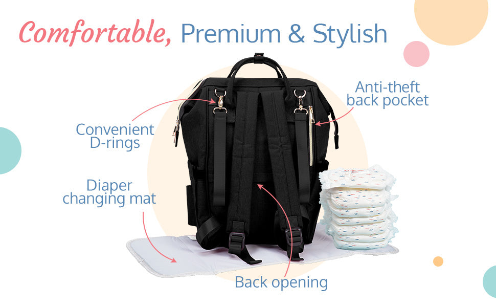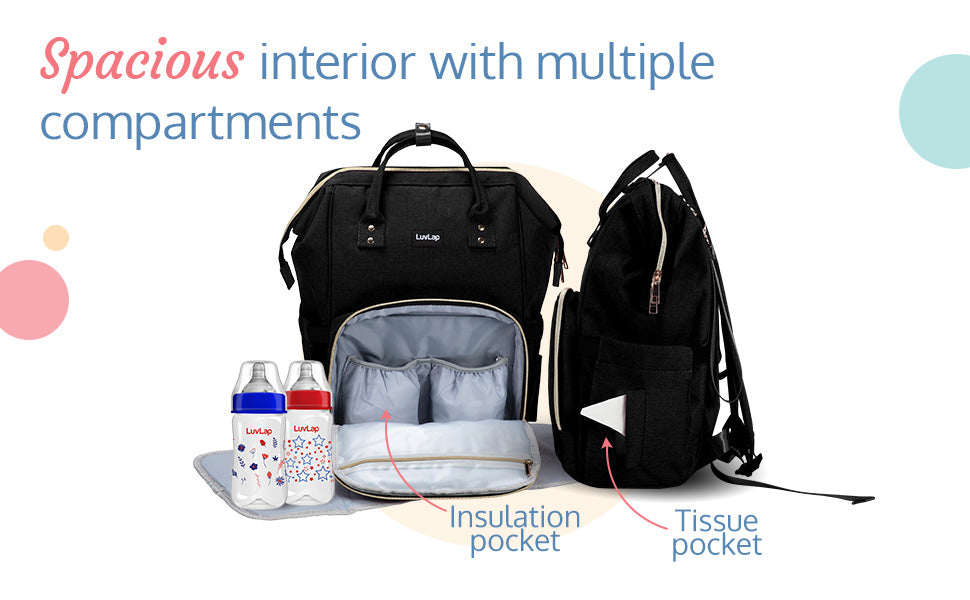 Two way carry-diaper bag can be carried both as a back pack or as a tote bag. Waterproof and easy to clean-made of premium oxford material makes this bag water resistant, thereby safe from water and milk spills. Large storage capacity with 15 pockets-7 inner pockets with a key ring holder and 8 outer pockets allows organizing items easily, making more space and finding essentials faster. 2 Insulated bottle holders with inner tin foil insulation layer, helps keep milk warm on-the-go, wide view top zipper compartment with metal support allows wide easy viewing to place or take out things easily, hidden anti-theft pocket design at the back and an easy access back pocket makes it convenient and secure. Unique tissue dispensing side pocket allow easy access to tissues during an accidental spill, includes diaper changing mat allowing convenient on-the-go diaper change.